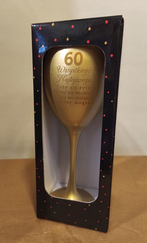 - Personalizowany kieliszek do wina z grawerem „Najlepsze dopiero przede mną”.