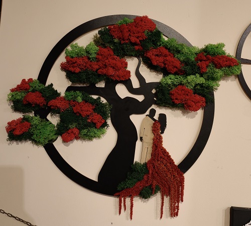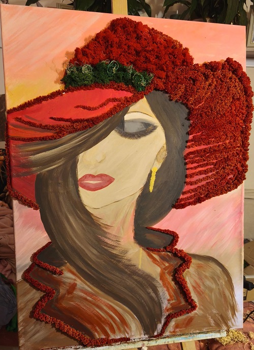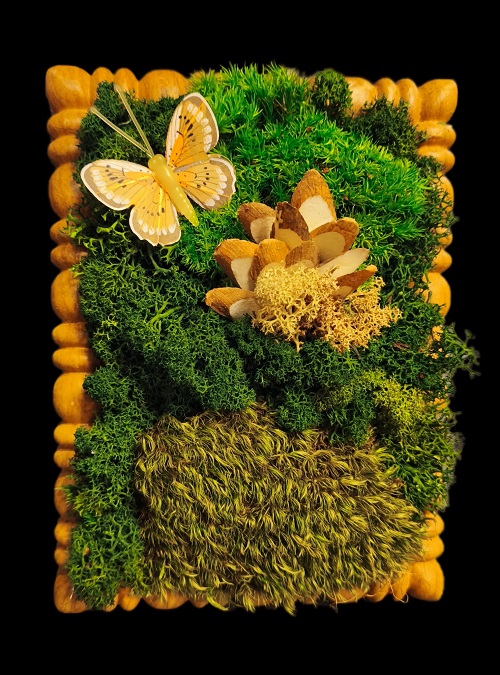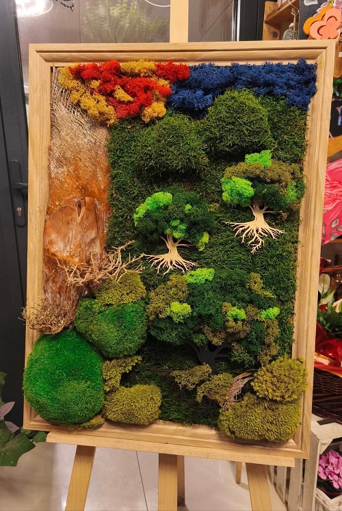 Każda praca zaczyna się od pomysłu i spokojnego procesu twórczego. Pędzel, farby, faktury, kolory… a potem natura. Mech chrobotek, który wykorzystujemy w naszych kompozycjach, jest materiałem wyjątkowym – miękkim, trójwymiarowym i pełnym życia. Dzięki procesowi stabilizacji zachowuje swój wygląd na długie lata, nie wymagając podlewania ani pielęgnacji.