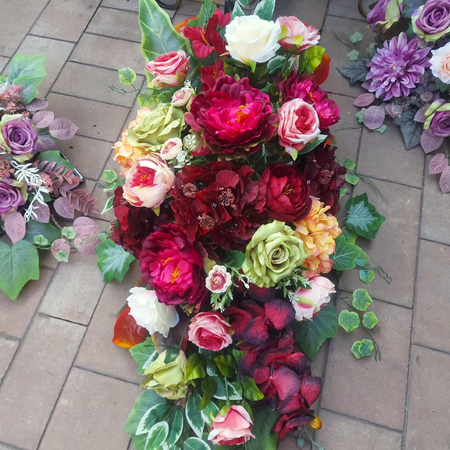 Ta kompozycja kwiatowa to bogata, kolorowa aranżacja sztucznych kwiatów, ułożona w formie rozłożystego bukietu. Dominują w niej duże, pełne kwiaty przypominające piwonie i róże w odcieniach intensywnej czerwieni, burgundu, różu, bieli, zieleni i pomarańczy, co tworzy gradient od ciemnych, głębokich tonów u góry do jaśniejszych i bardziej pastelowych na dole. Całość jest wzbogacona zielonymi liśćmi o różnych kształtach, w tym szerokimi i błyszczącymi liśćmi bluszczu. Kompozycja przeznaczona na okazje memorialne, z lekkim jesiennym akcentem dzięki ciepłym barwom.