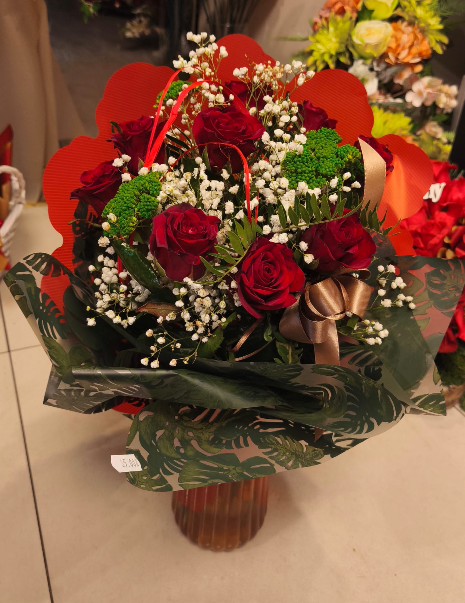 Ten bukiet to elegancka kompozycja złożona z czerwonych róż, które są głównym elementem tego bukietu. Uzupełnione gipsówką oraz zielonymi akcentami. Całość owinięta w ozdobny papier z motywem zielonych liści, przewiązany czerwoną wstążką co nadaje mu romantyczności