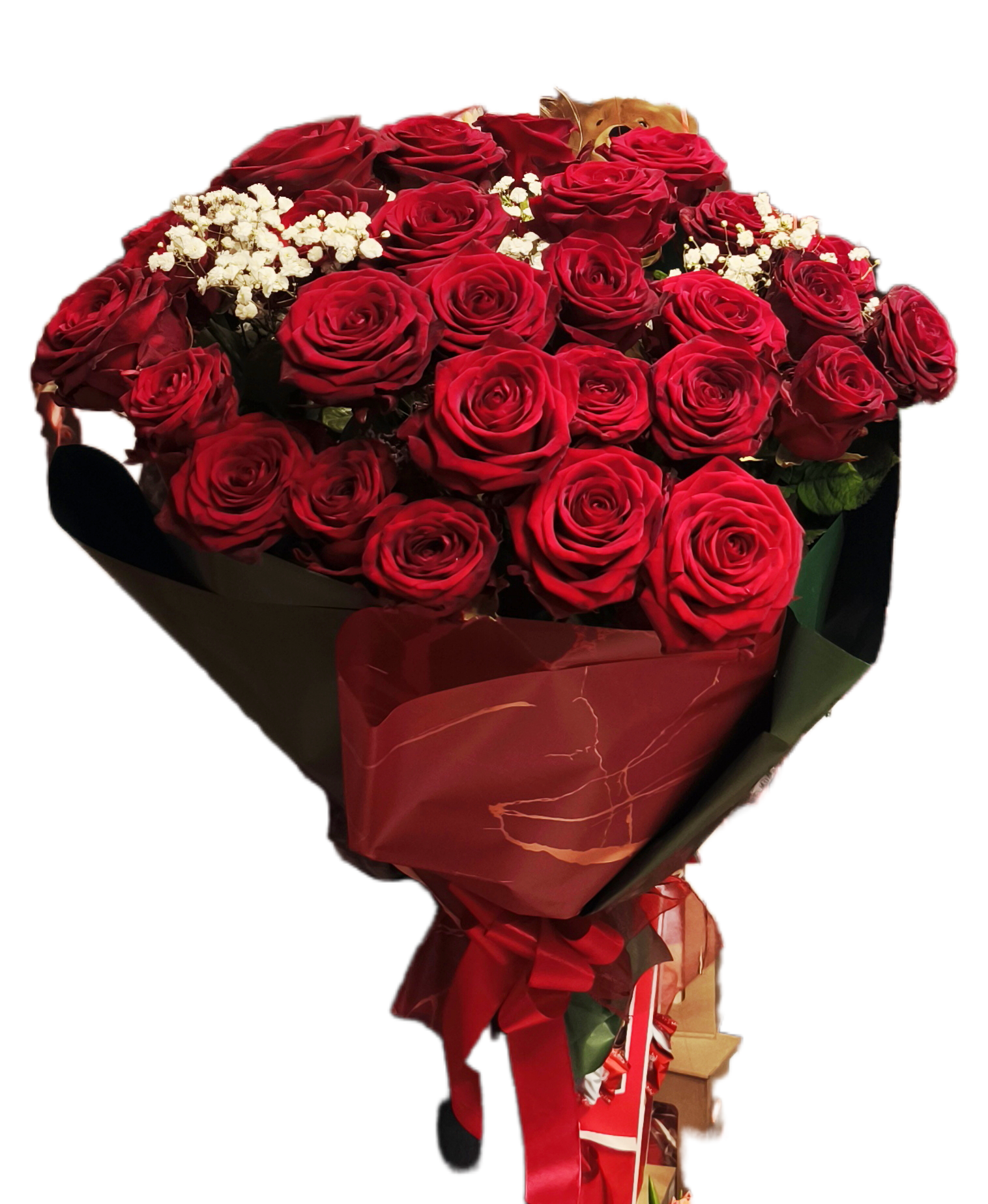 W tej ofercie bukiet skomponowany jest z 29 długich róż trwałego gatunku z dużym pąkiem kwiatowym z dodatkiem gipsówki oraz udekorowany dekoracyjnym papierem florystycznym oraz dużą atłasową kakardą.