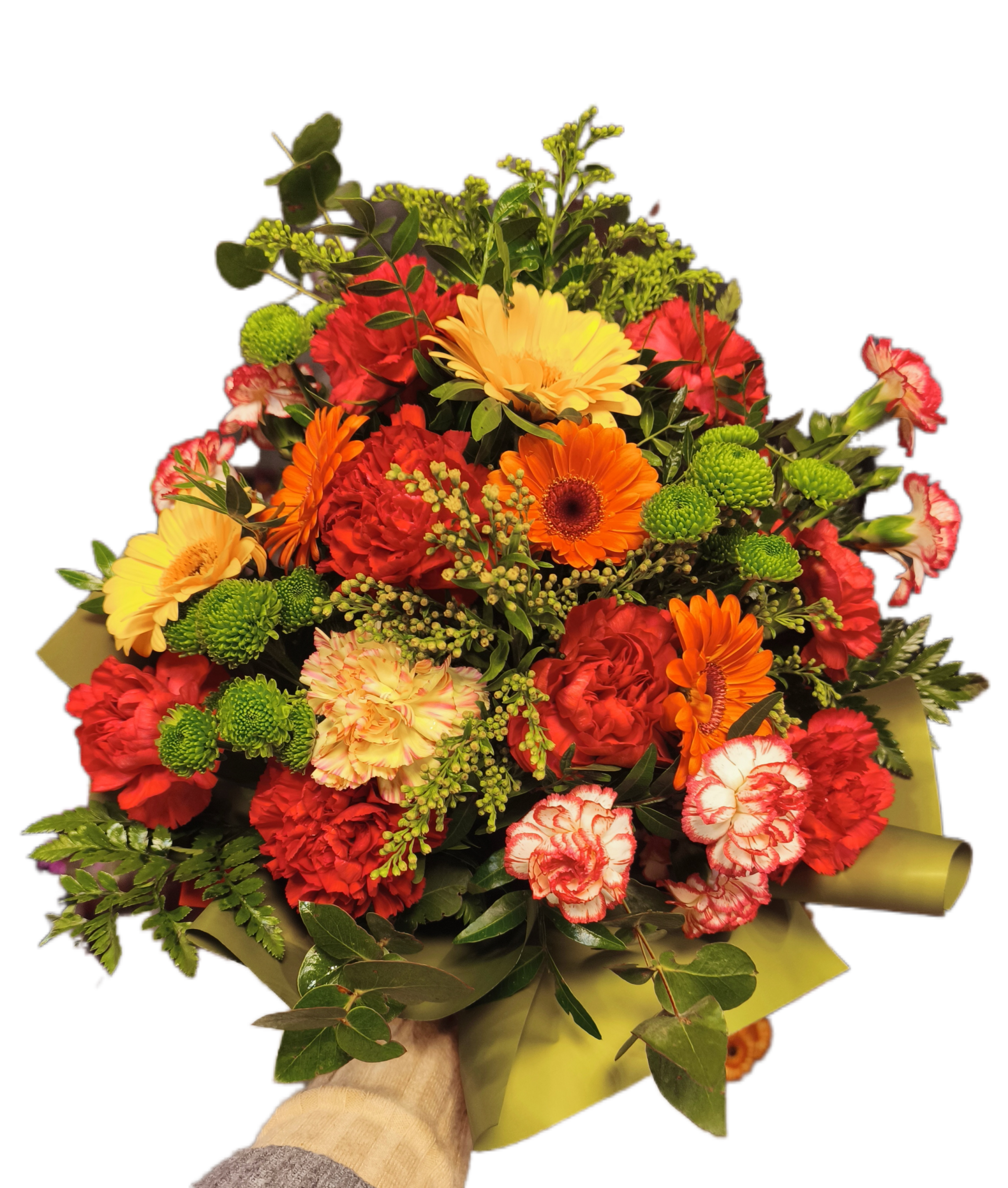 Duży bukiet wielokwiatowy w wiosennych barwach ,gustownie skomponowany ze świeżych kwiatów kilku gatunków, przystrojony papierem florystycznym oraz dużą kokardą.