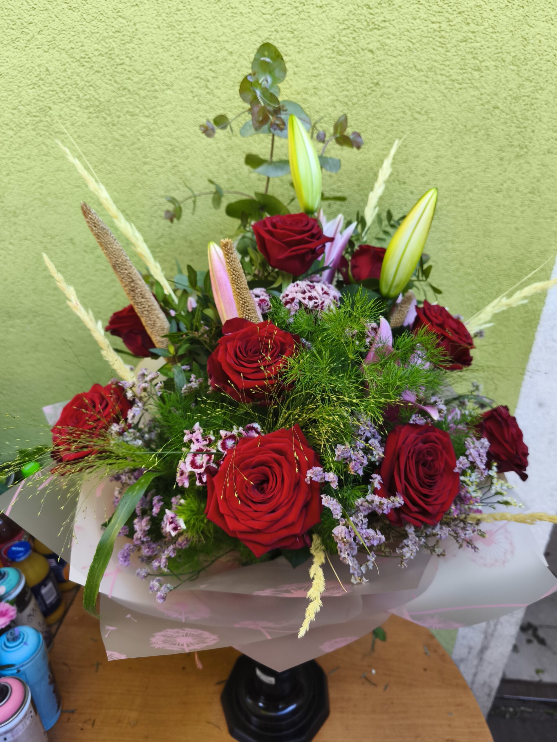 Klasyczny bukiet kwiatów róż z lilią orientalną układany w formie stopniowanej z dodatkiem roślin zielonych, limonium oraz naturalnych traw. Bukiet ten sprawdzi się na wiele okazji i uroczystości. Elegancja i klasa tej kompozycji z pewnością mile zaskoczy jubilata.