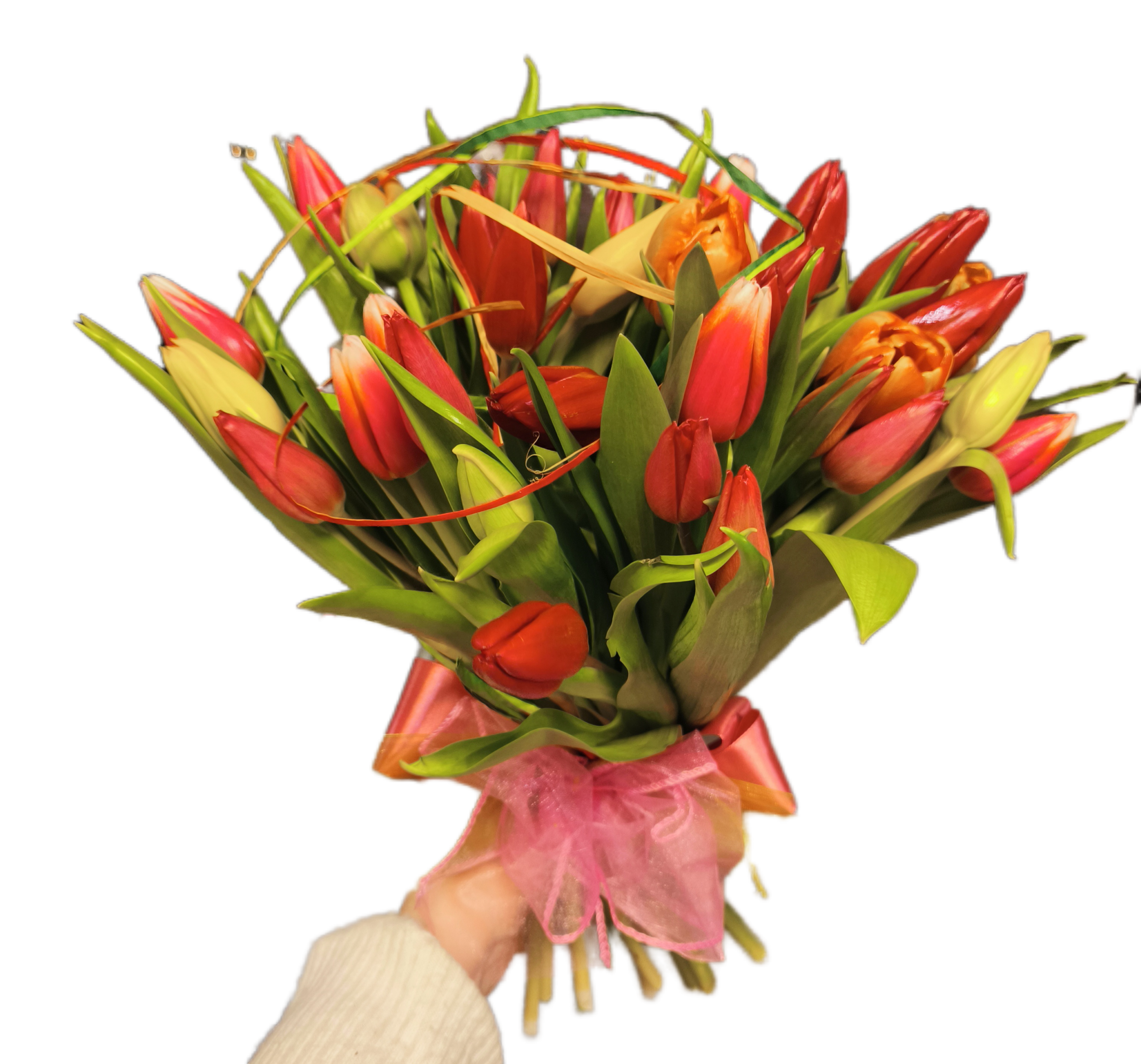 Zdjęcie przedstawia bukiet w wersji średniej 35 szt. kolorowych tulipanów.