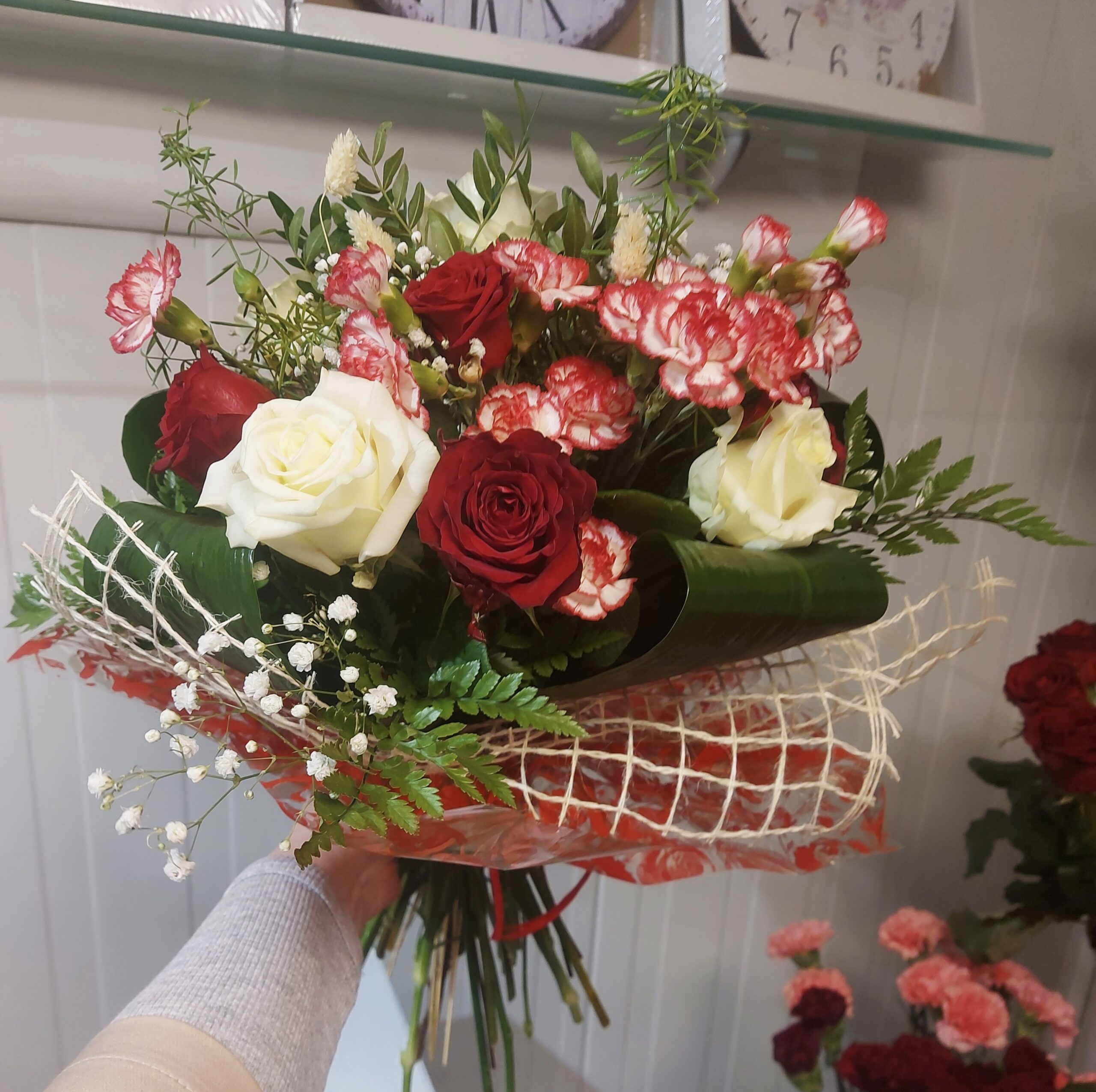 Bukiet kwiatów o charakterze klasycznym, skomponowany ze świeżych róż białych i czerwonych oraz biało czerwonych gożdzików gałązkowych.Całość kompozycji wypełniona jest również zielonymi roślinami oraz udekorowana jest naturalną tzw. siatką rybacką oraz dekoracyjnym papierem do kwiatów i atłasową wstążką.