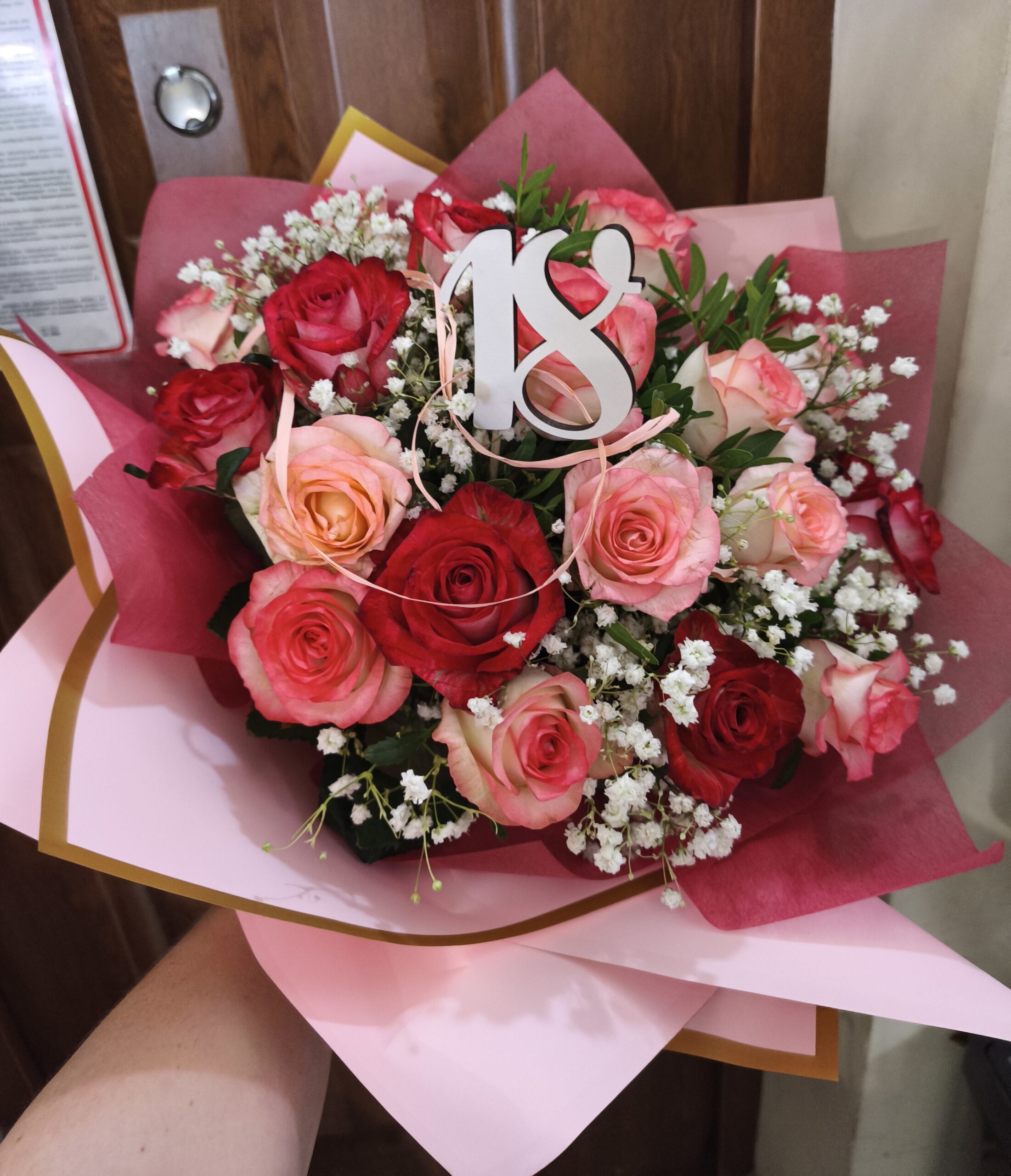 Klasyczny bukiet osiemnastu różowych róż na 18-ste urodziny, dla córki, koleżanki, siostry czy sąsiadki. Piękne wyselekcjowane róże skomponowane gustownie w dwóch odcieniach różu, ułożone profesjonalnie w formie okrągłej z dodatkiem delikatnej gipsówki, gustownie udekorowane eleganckim papierem florystycznym, drewnianym elementem dekoracyjnym z liczbą 18 oraz dużą kokarda atłasową.
