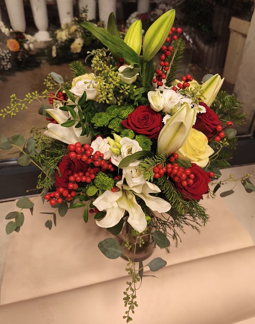 To bogaty, świąteczny bukiet idealny na ślub zimowy, urodziny, Święta,Dzień Babci i Dziadka czy inne okazje. Dominują głębokie czerwone i kremowe róże, białe lilie i eustomy, uzupełnione zielonymi santini (chryzantemami), srebrzystym eukaliptusem, iglastą zielenią oraz dekoracyjnymi czerwonymi jagodami. Całość jest pełna, luksusowa i romantyczna – łączy klasyczną elegancję z ciepłym, bożonarodzeniowym akcentem.