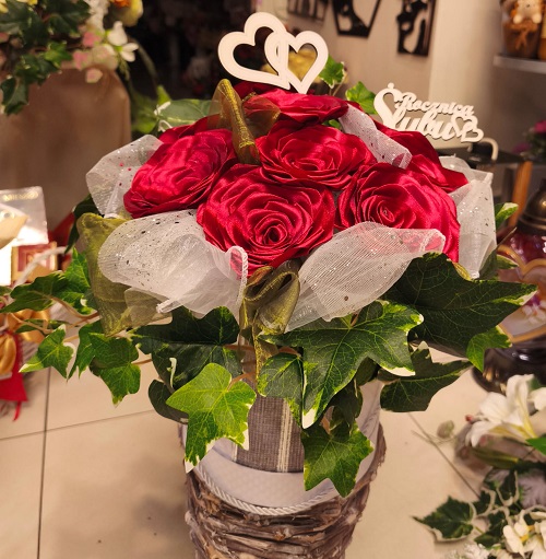 Kompozycja ta stworzona jest z róż atłasowych, ręcznie robionych udekorowanych materiałami florystycznymi oraz zielonym bluszczem ,który nadaje kompozycji bardzo naturalnego wyglądu.