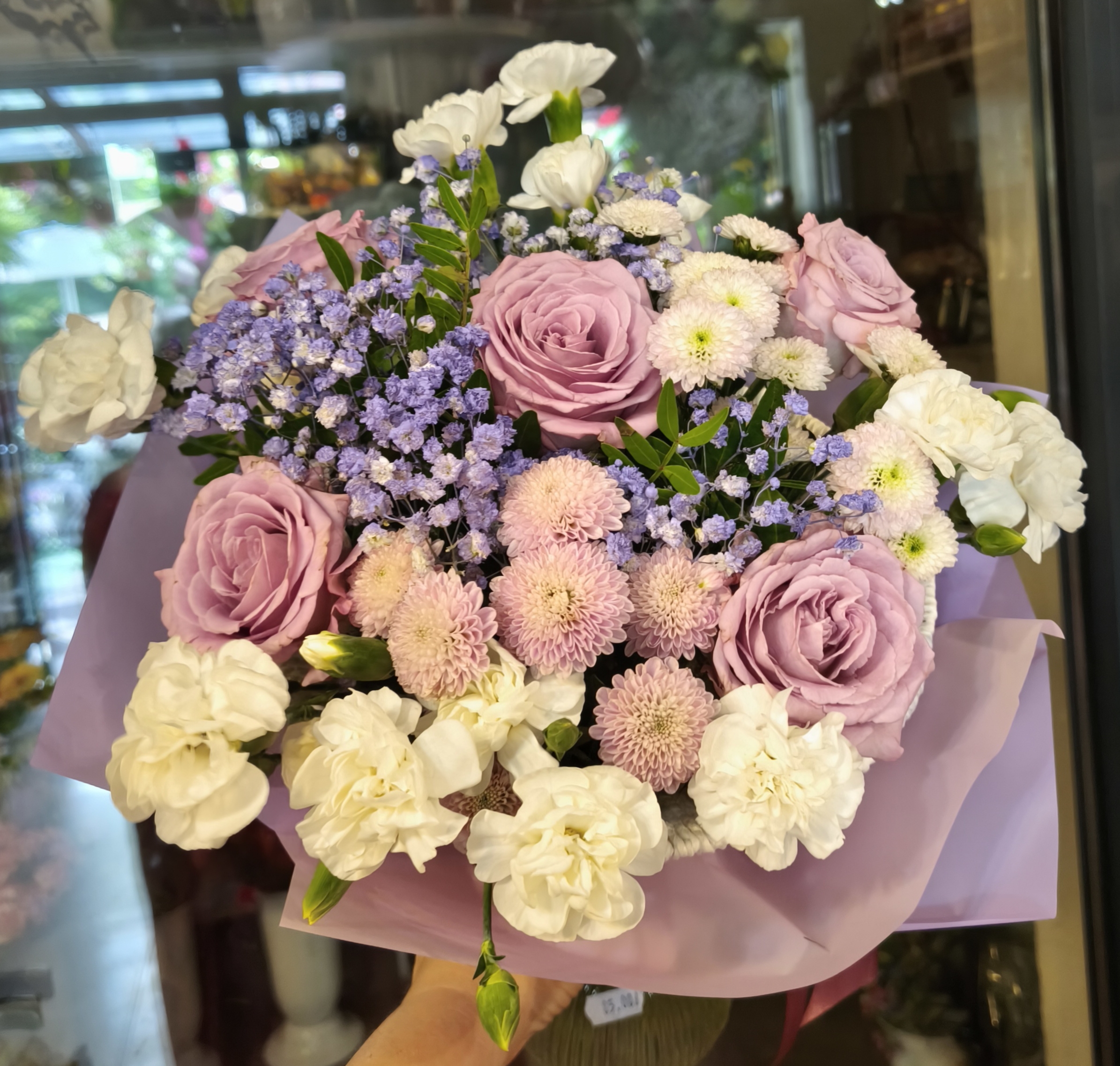 Elegancki bukiet kwiatów o charakterze bardzo romantycznym ,w kolorystyce fioletowo białej z precyzyjnie i gustownie dobranymi dodatkami. Bukiet ten spełni się na wiele okoliczności np.randka, zaręczyny, dla żony, dla kobiety, jako prezent ślubny oraz z okazji urodzin dla delikatnej i romantycznej solenizantki.