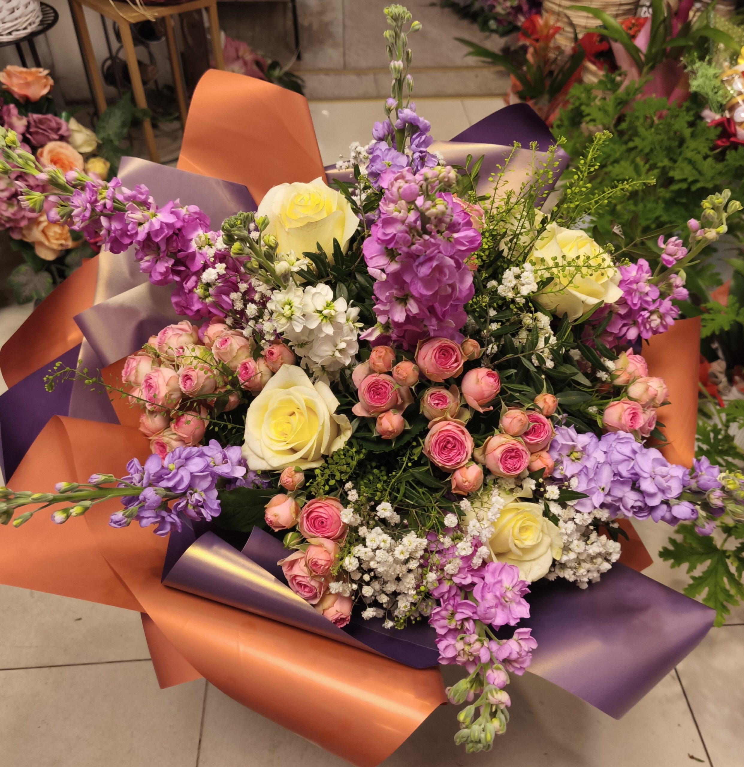 Bukiet wielokwiatowy skomponowany w wersji mega z wielu gatunków kwiatów sezonowych oraz całorocznych róż. Taki mega bukiet to wspaniały prezent dla kobiety na każdą okazję.
