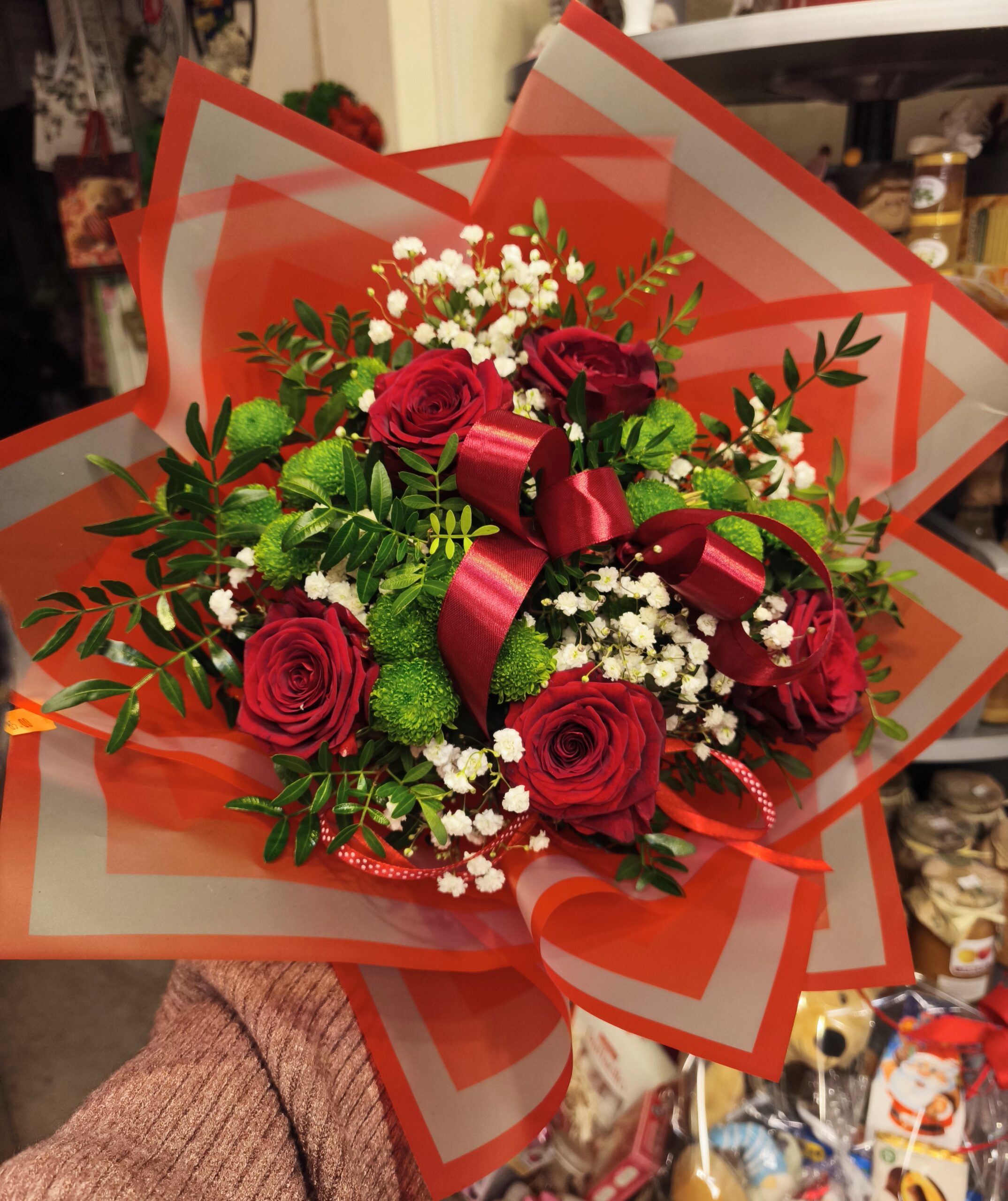 Wyjątkowy bukiet, który jest symbolem miłości, pasji i elegancji. Kompozycja składa się z intensywnie czerwonych róż, delikatnej białej gipsówki oraz świeżej zieleni dekoracyjnej. Całość została starannie zapakowana w efektowne, czerwono-białe papiery florystyczne i ozdobiona elegancką satynową kokardą.