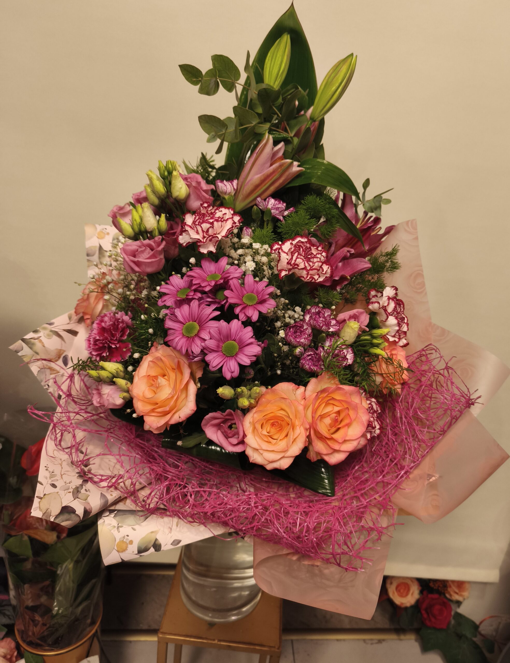 Bukiet wielokwiatowy duży dla kobiety ,skomponowany jest w formie stopniowanej z wielu gustownie dobranych gatunków kwiatów. To elegancka kompozycja która z pewnością mile zaskoczy każdą kobietę. Kolorystyka bukietu to subtelne połączenie delikatnego różu i romantycznego fioletu.