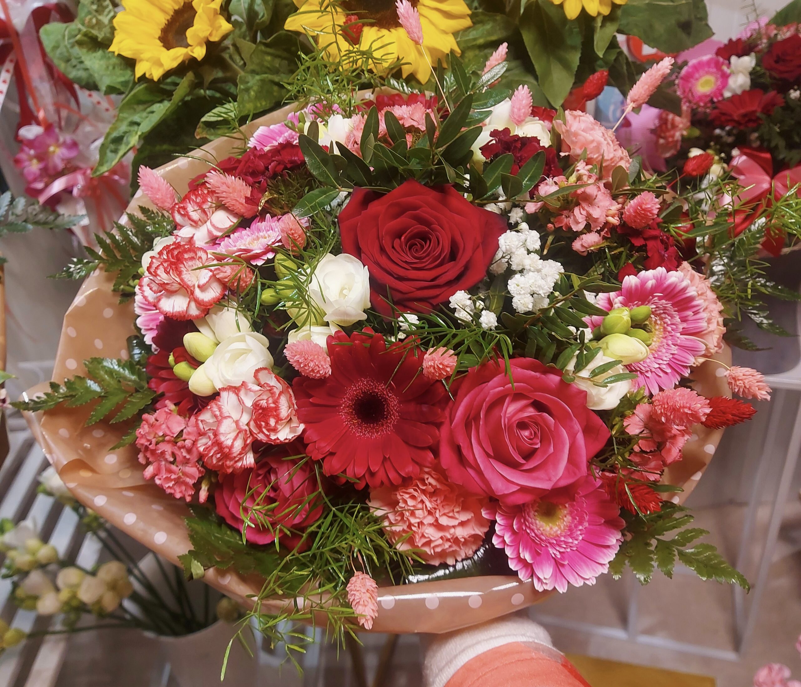 Bukiet wielokwiatowy skomponowany w formie okrąglej z pięciu gatunków kwiatów w kolorach kilku odcieni różu ,czerwieni i bieli z dodatkiem zieleni.