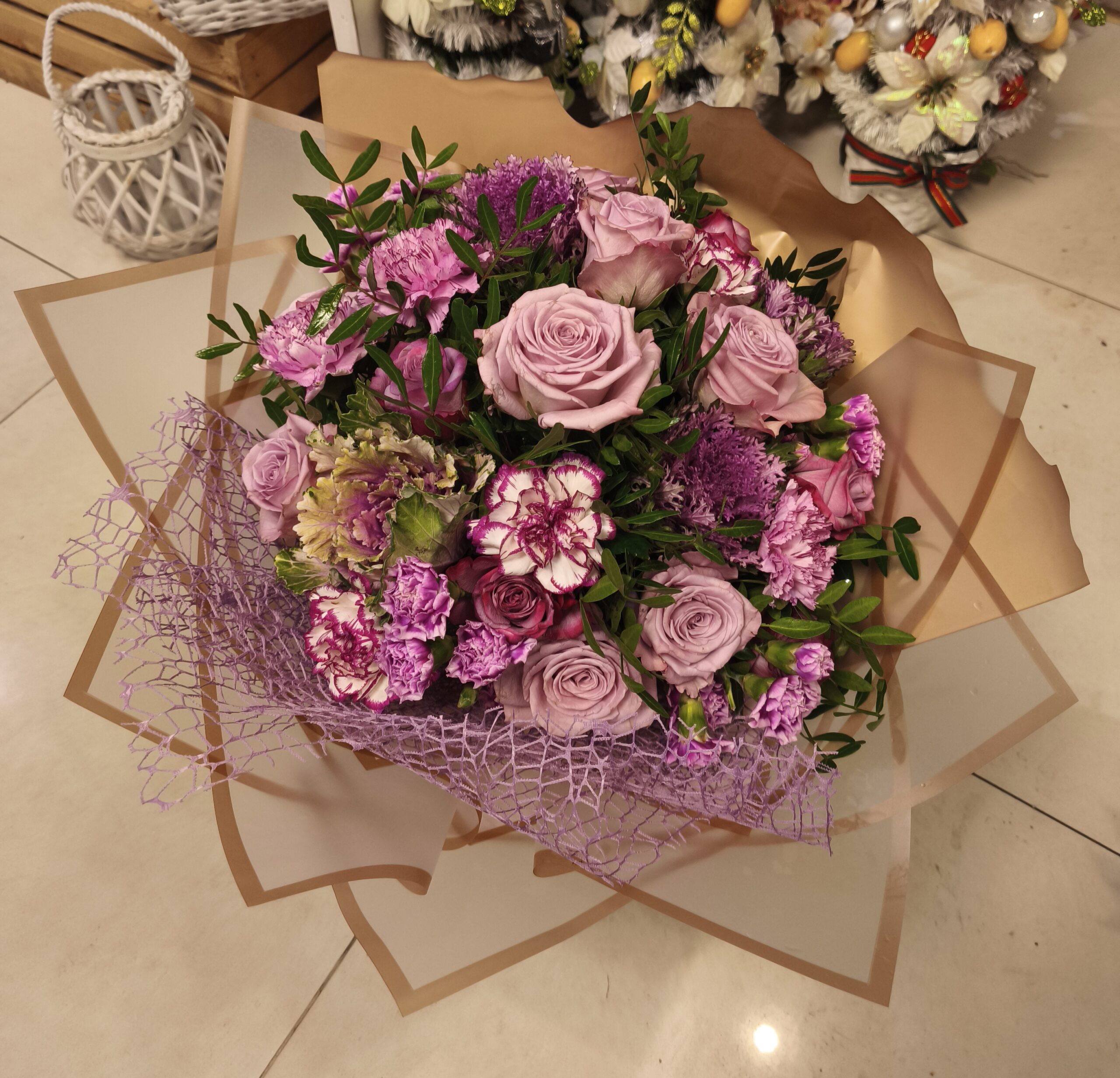 Elegancki, delikatny zarówno romantyczny bukiet kwiatów, skomponowany z wielu gatunków kwiatów w odcieniach pięknego fioletu. Bukiet ułożony jest skrętolegle w formie okrągłej. Starannie dobierane kwiaty ,dobrych i trwałych gatunków przekładane są soczystą zielenią .Całość kompozycji udekorowana jest dekoracyjną koronką oraz papierem florystycznym do kwiatów.