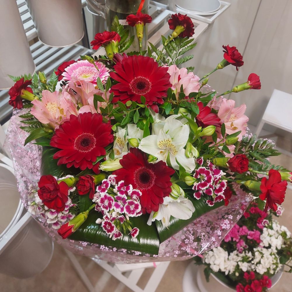 - Gatunki kwiatów: gerbery, goździki gałązkowe ,gożdziki kamienne lub alstromerie – w różnych kolorach, które wprowadzają świeżość i energię.