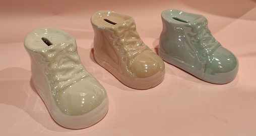 Małe, ręcznie malowane skarbonki w kształcie dziecięcych trampeczków – idealny, słodki i praktyczny prezent na Chrzest Święty lub Roczek