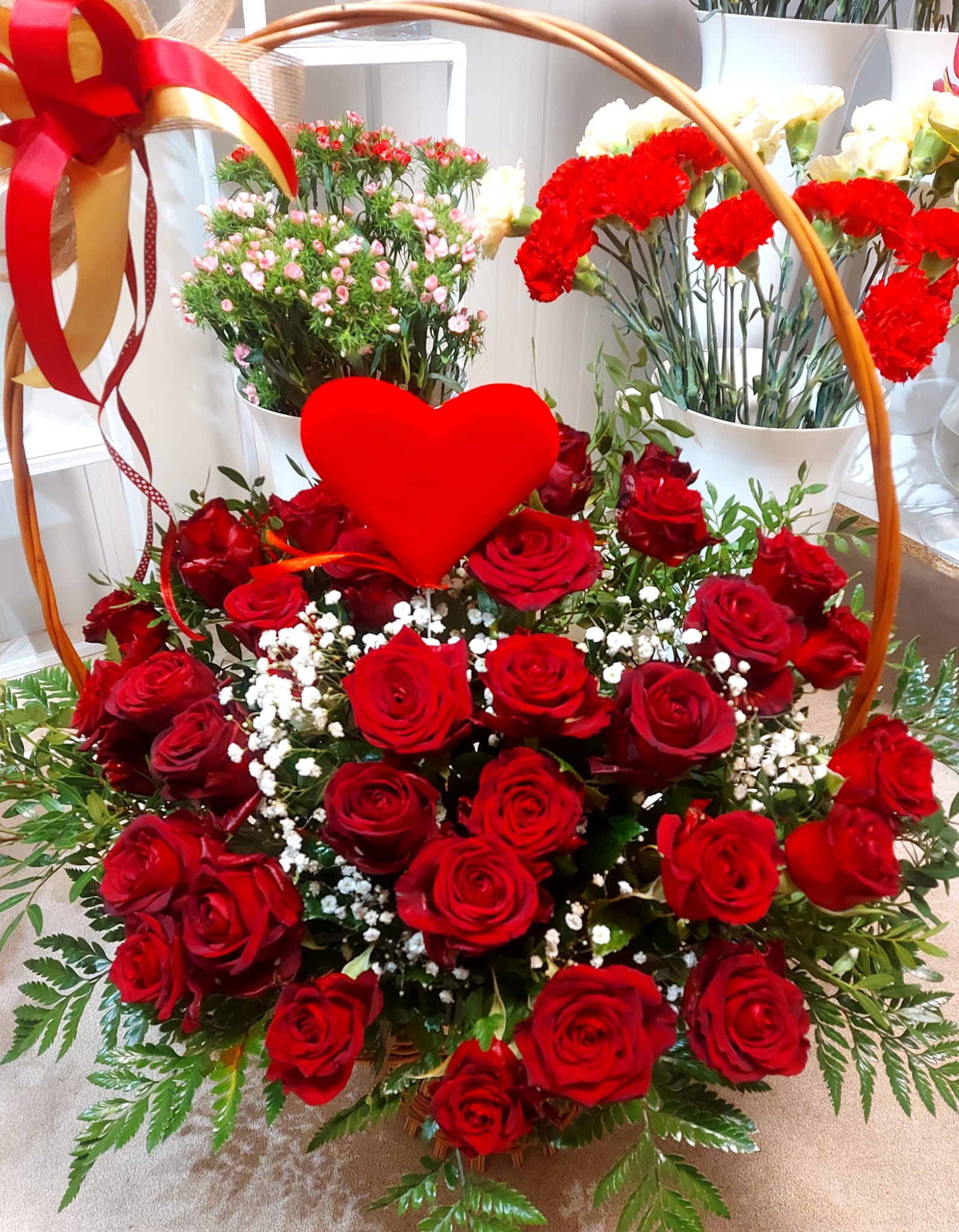 Ta kompozycja to romantyczny kosz z czerwonymi różami, ułożonymi w kształt serca, przyozdobionymi białą gipsówką i roślinami zielonymi. Całość jest przewiązana czerwono – złotą wstążką, a zielone liście dodają naturalnego akcentu. Prezentuje się elegancko i idealnie nadaje się na wiele okazji: