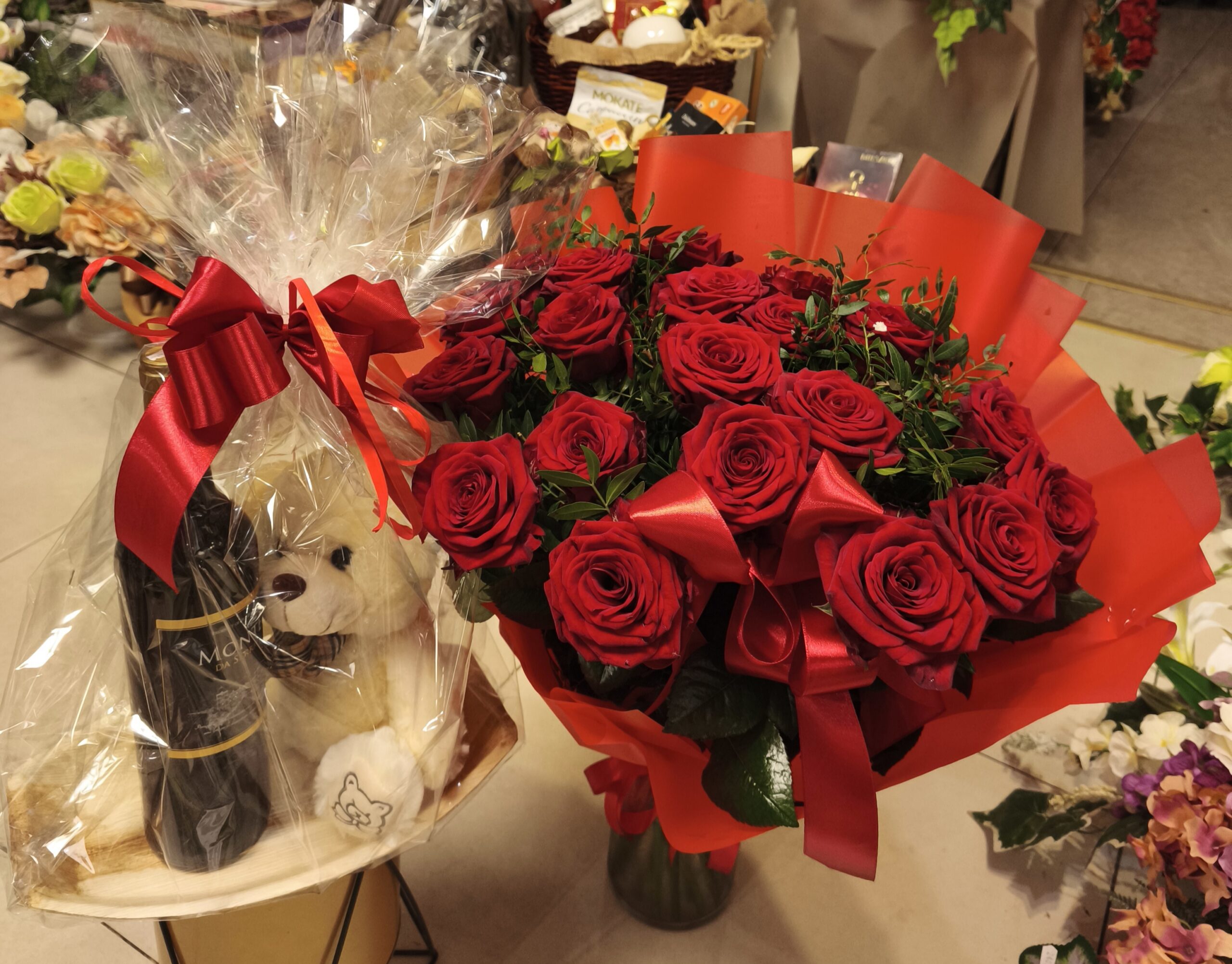 Czerwone długie róże ,miś i wino
