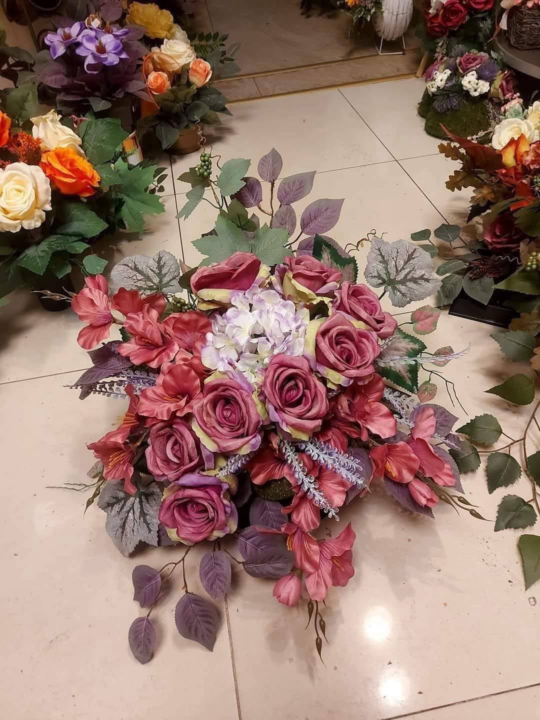 Ten urokliwy stroik zachwyca delikatną kompozycją z różami w odcieniach różu i fioletu, przeplatanymi białymi hortensjami. Otoczony subtelnymi liśćmi i trawami, tworzy elegancką i harmonijną dekoracje, idealną na Święto Wszystkich Zmarłych