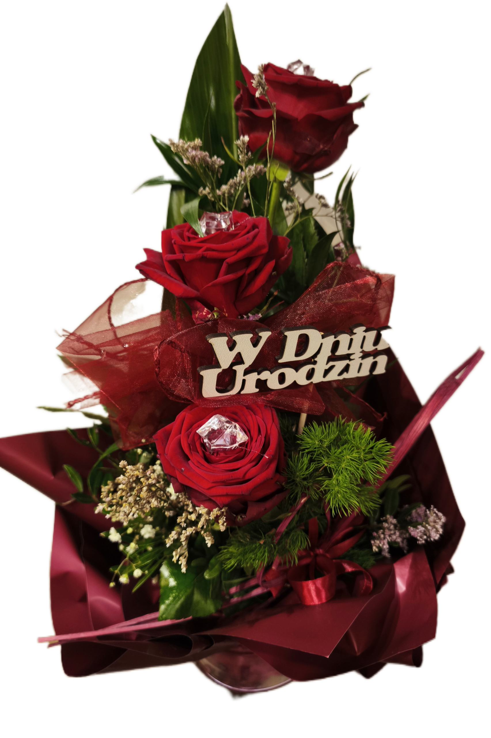 Klasyczny bukiet przepięknych 3 czerwonych długich róż Red Naomi z dużym pąkiem, ułożony w formie stopniowanej na długim liściu oraz udekorowane imitacją diamencików oraz roślinami zielonymi i materiałami florystycznymi.