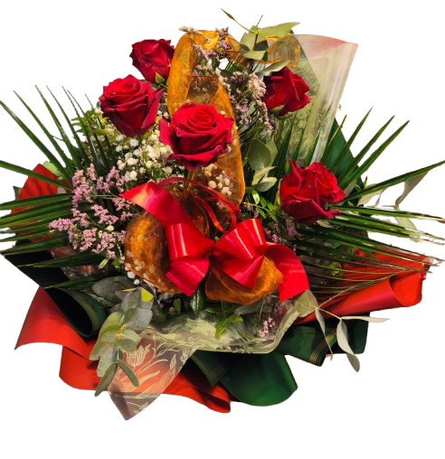Piękny, bogaty bukiet z pięcioma długimi, wyselekcjonowanymi czerwonymi różami najwyższej jakości, o głębokim, aksamitnym odcieniu i dużych, idealnie rozłożonych kwiatach. Towarzyszy im obfite, naturalne przybranie: szlachetny eukaliptus o srebrzysto-zielonych listkach, delikatna pistacja, subtelna gipsówka(gypsophili) i limonium w odcieniach pudrowego różu oraz dodatki, które dodają lekkości i objętości. Całość owinięta w eleganckie, połyskliwe pomarańczowo-czerwone akcenty i zielone liście palmowe – klasyczny, ale bardzo efektowny i romantyczny bukiet.