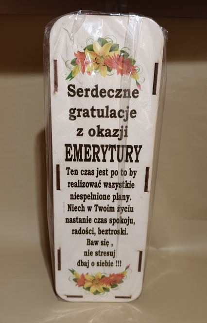 W środku czeka miejsce na ulubione wino (lub inny trunek), a na froncie wypalone ciepłe życzenia:
