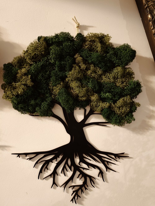 Na ścianie wyrasta monumentalne Drzewo Życia – symbol siły, trwałości, korzeni rodzinnych i rozkwitu. Korona drzewa to gęsta, puszysta chmura z wielowarstwowego stabilizowanego mchu w bogatej palecie zieleni: od jasnej limonki, przez szmaragd i oliwkę, aż po głęboki butelkowy las. Mech chrobotek, reniferowy i poduszkowy układa się w nieregularne, żywe kępy, które miejscami wystają 4–6 cm poza płaszczyznę – dzięki temu drzewo wygląda, jakby naprawdę rosło z ściany i oddychało.