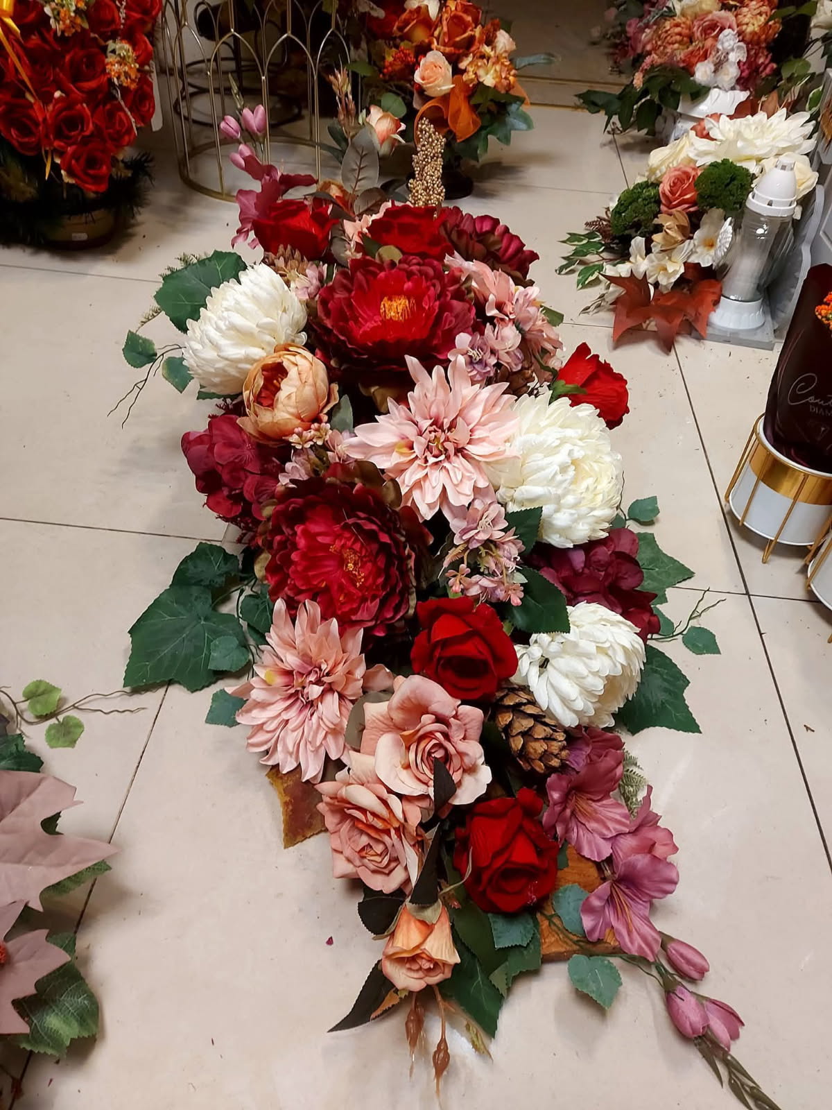 Ten bardzo duży stroik nagrobny to okazała kompozycja wykonana na drewnianej desce, złożona ze sztucznych kwiatów w odcieniach czerwieni, różu, brzoskwini i bieli, w tym pełnych róż, peonii, chryzantem. Dekoracje uzupełniają zielone liście oraz delikatne akcenty, takie jak szyszki i jesienne liście, co nadaje jej naturalnego i eleganckiego wyglądu. Idealny jako okazała dekoracja cmentarna