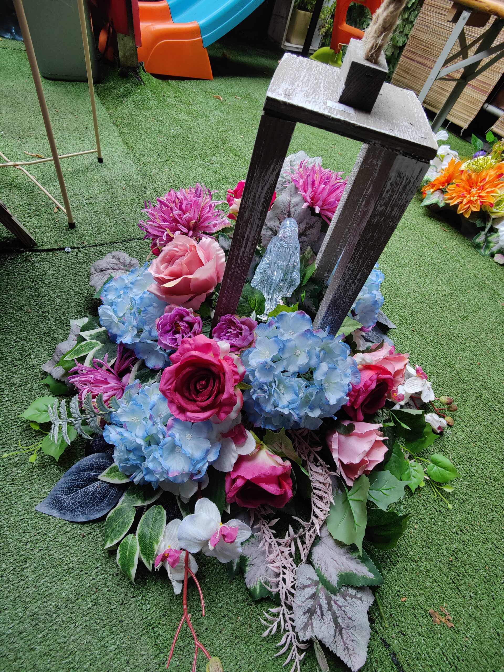 Kompozycja składa się z kolorowych sztucznych kwiatów, w tym róż w odcieniach różu i czerwieni, niebieskich hortensji oraz fioletowych chryzantem. Z dodatkiem zielonych i szarych liści oraz białych orchidei tworzy harmonie i elegancje. Centralnym elementem jest drewniana konstrukcja ,która jest fundamentem oraz elementem dekoracyjnym kompozycji. w środkowym punkcie kompozycji znajduje się elektryczna figurka LED Matki Boskiej .Możliwość doboru koloru : naturalny biały lub niebieski.