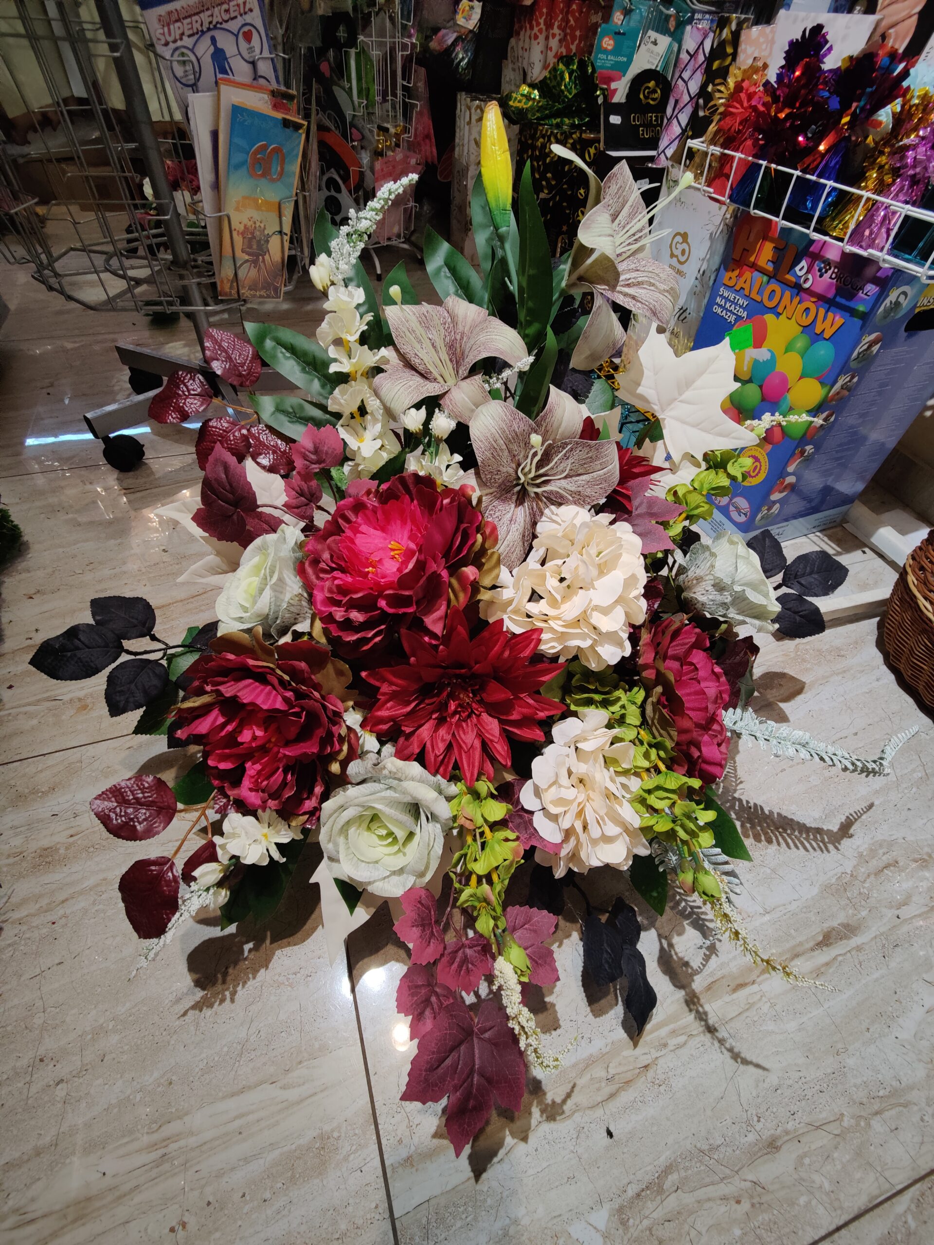 Ten piękny stroik zachwyca bogactwem kolorów i form. Składa się z głęboko czerwonych i różowych peonii, białych oraz kremowych róż, a także delikatnych lilii. Urozmaicają go zielone liście, czarne akcenty i bordowe liście, razem tworzą elegancje i harmonie