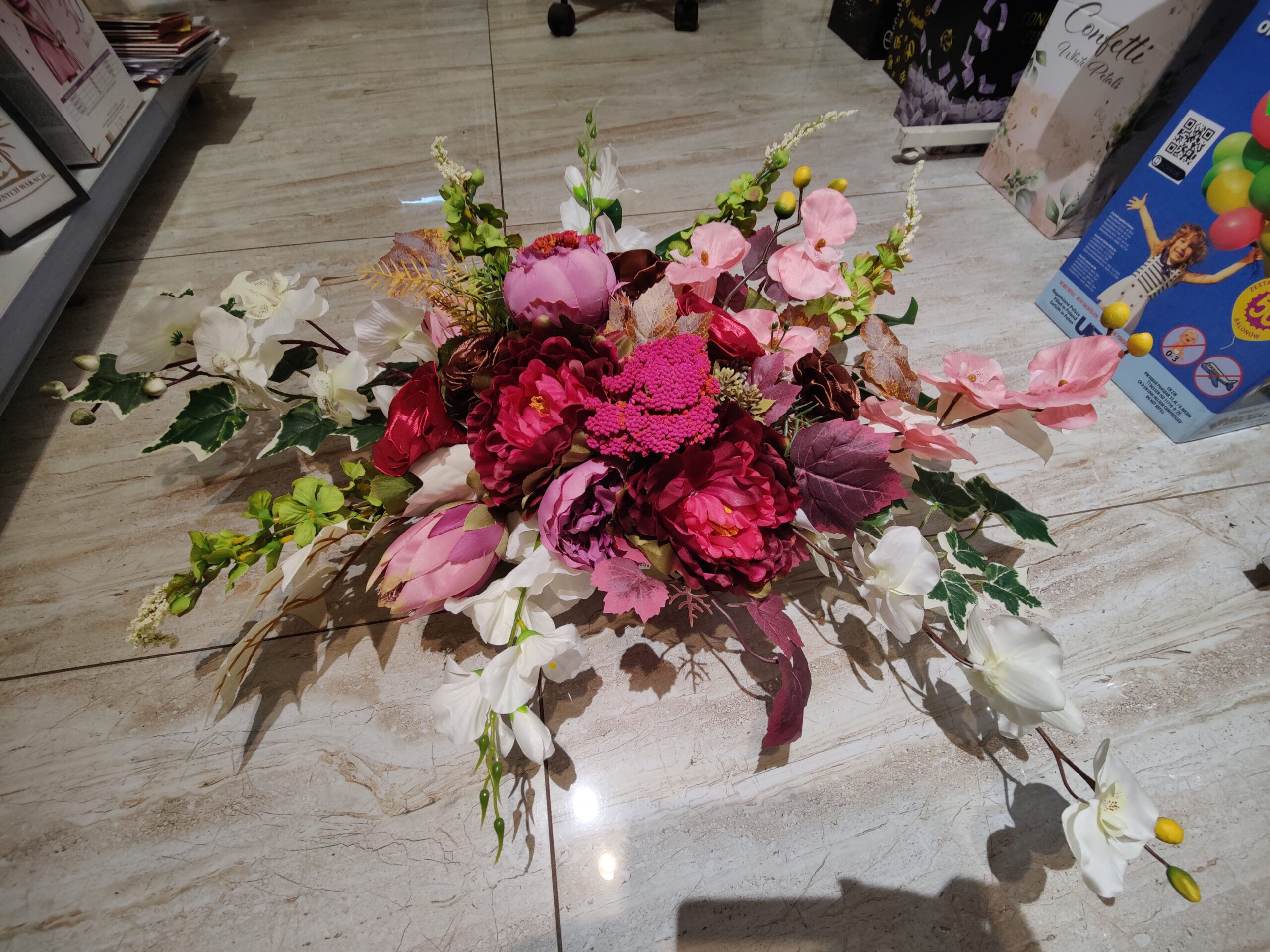 Stroik składa się z bogatej kompozycji sztucznych kwiatów w odcieniach czerwieni, różu, bieli i fioletu, zdominowany przez pełne pąki piwonii i delikatne orchidee. Uzupełniony jest zielonymi liśćmi, drobnymi gałązkami i brązowym akcentem, co nadaje mu naturalny i elegancki wygląd