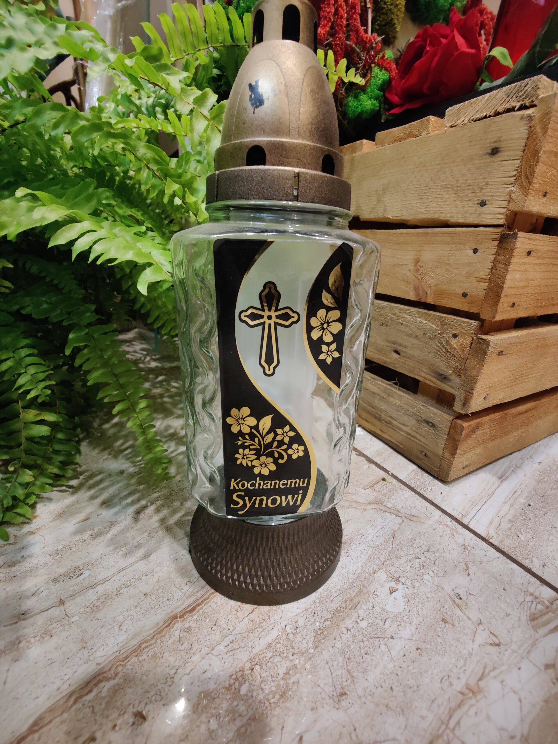 Ten elegancki znicz zachwyca swoim klasycznym desiginem. Wykonany z przezroczystego szkła, ozdobiony jest subtelnym wzorem kwiatowym i krzyżem w złotym odcieniu, co nadaje mu wyjątkowego uroku.