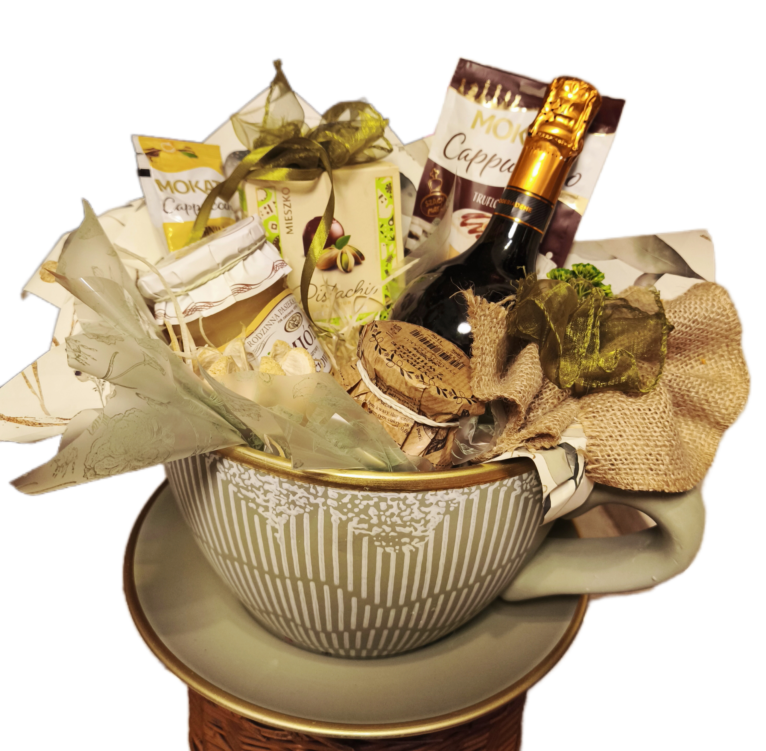 Całość została umieszczona w ozdobnej filiżance z podstawką, udekorowanej naturalnymi tkaninami, jutą i satynową wstążką. Stonowana, kremowo-złota kolorystyka nadaje zestawowi subtelnego, luksusowego charakteru.
