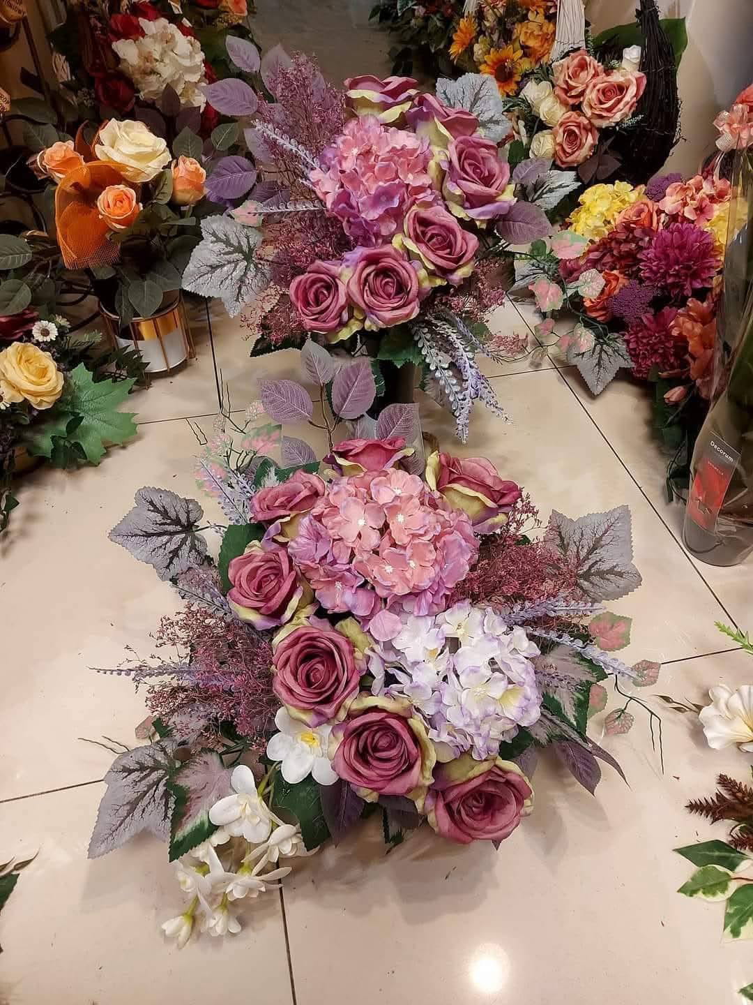 Zestaw składa się z dwóch eleganckich aranżacji kwiatowych z różami, hortensjami i delikatnymi liśćmi w odcieniu różu, fioletu i bieli. Całość tworzy subtelną i stylową aranżacje