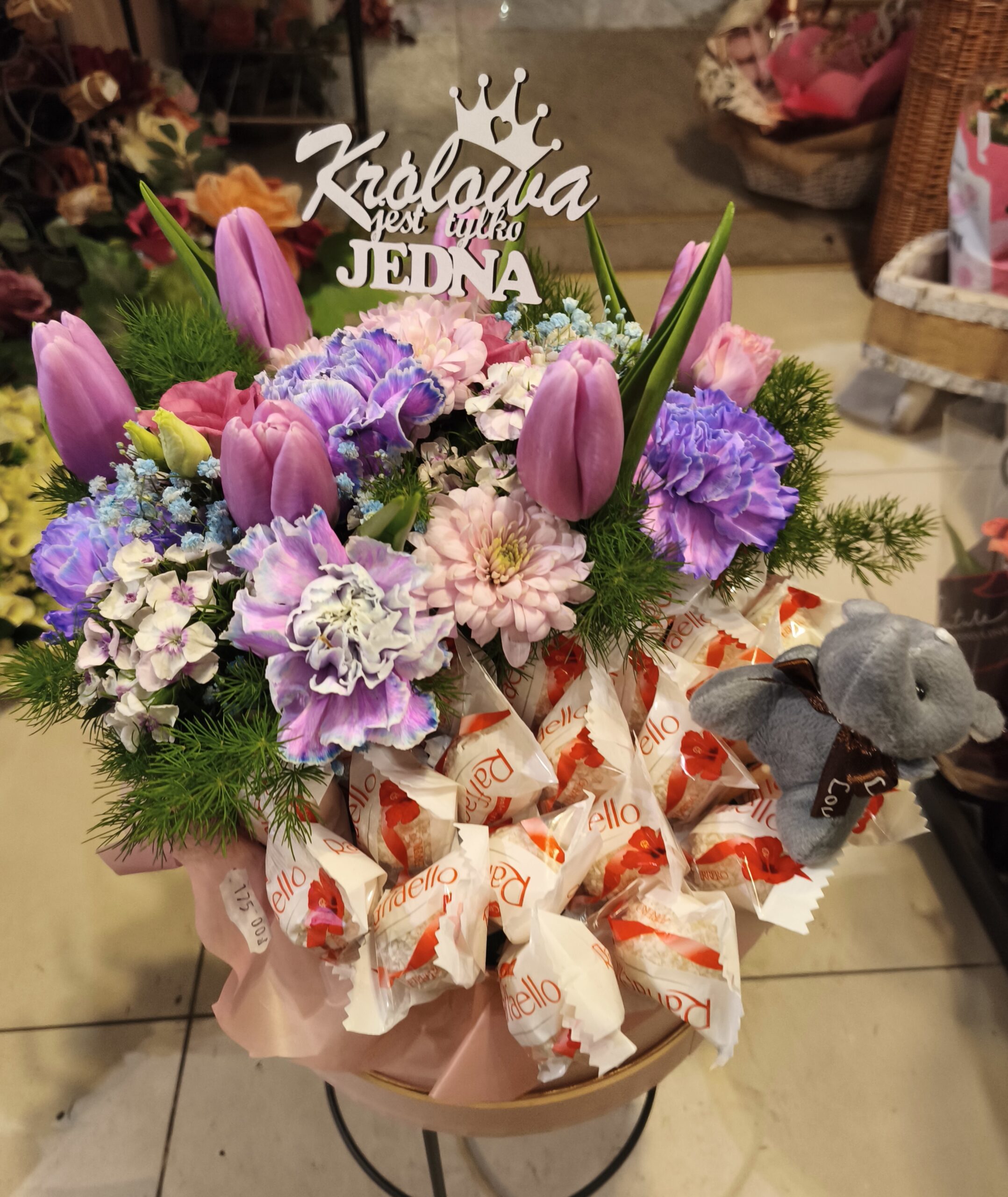 Flower box lila róż Raffaello to bardzo subtelna i delikatna kompozycja kwiatów w kolorach pastelowych w połowie wypełniona pralinami Raffaello. Kompozycja ta stworzona jest dla kobiety z klasą zarówno delikatnej i romantycznej.Kwiaty ukladane są w mokrej gąbce florystycznej w okragłym pudełku z pokrywą. Pudełko w połowie jest wypełnione smakowitymi ,kokosowymi pralinami.Na góże kompozycji umieszczone są dwa elementy dekoracyjne w postaci słonika oraz żartobliwego napisu „Królowa jest tylko jedna”.Całość udekorowana jest atłasową wstążką i kokardą.