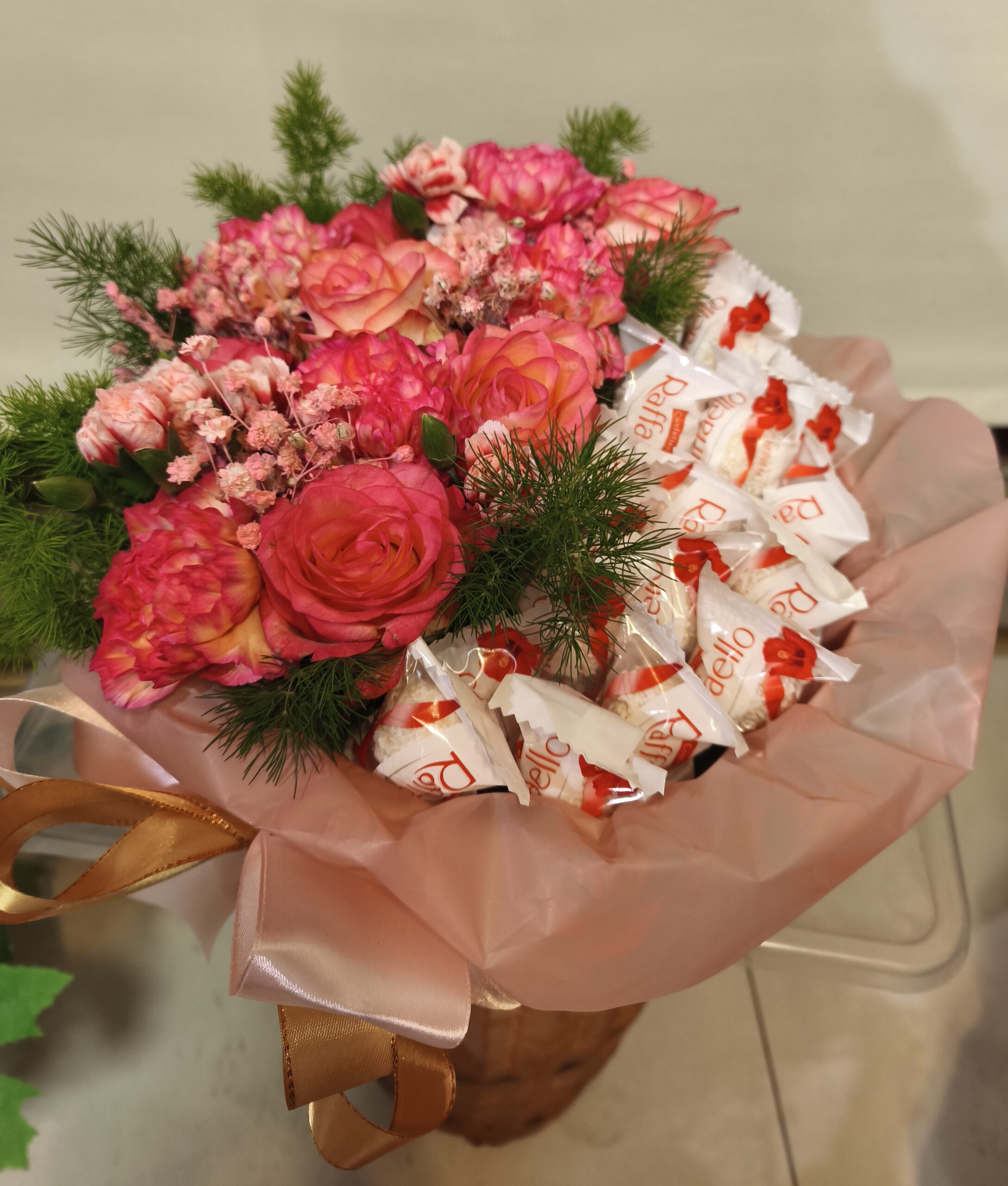 Elegancki Flower Box w wersji dużej z klasyczną różą i gożdzikiem w odcieniach różu z pralinami raffaello. To duża okrągła kompozycja bardzo wyrazista a zarazem subtelna, skomponowana w okrągłym pudełku z pokrywką w kolorze jasno różowym. Pudełko wypełnione jest pięknymi świeżymi różami i gożdzikiem w kolorze różowym ,różową gipsówką oraz kokosowymi pralinami Raffaello. Całość udekorowana jest atłasową wstążką i kokardą w kolorze różowo złotym.