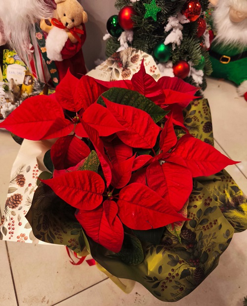 Piękna, zdrowa poinsecja w doniczce owiniętej ozdobnym papierem w motywy świąteczne, otoczoną bożonarodzeniowymi dekoracjami – idealny akcent na wigilijny stół lub parapet.