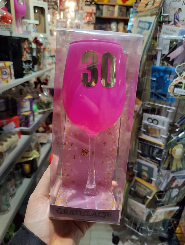 Szklany kieliszek do wina, prezent na 30te urodziny. Kolor różowy, wysokość ok 23cm