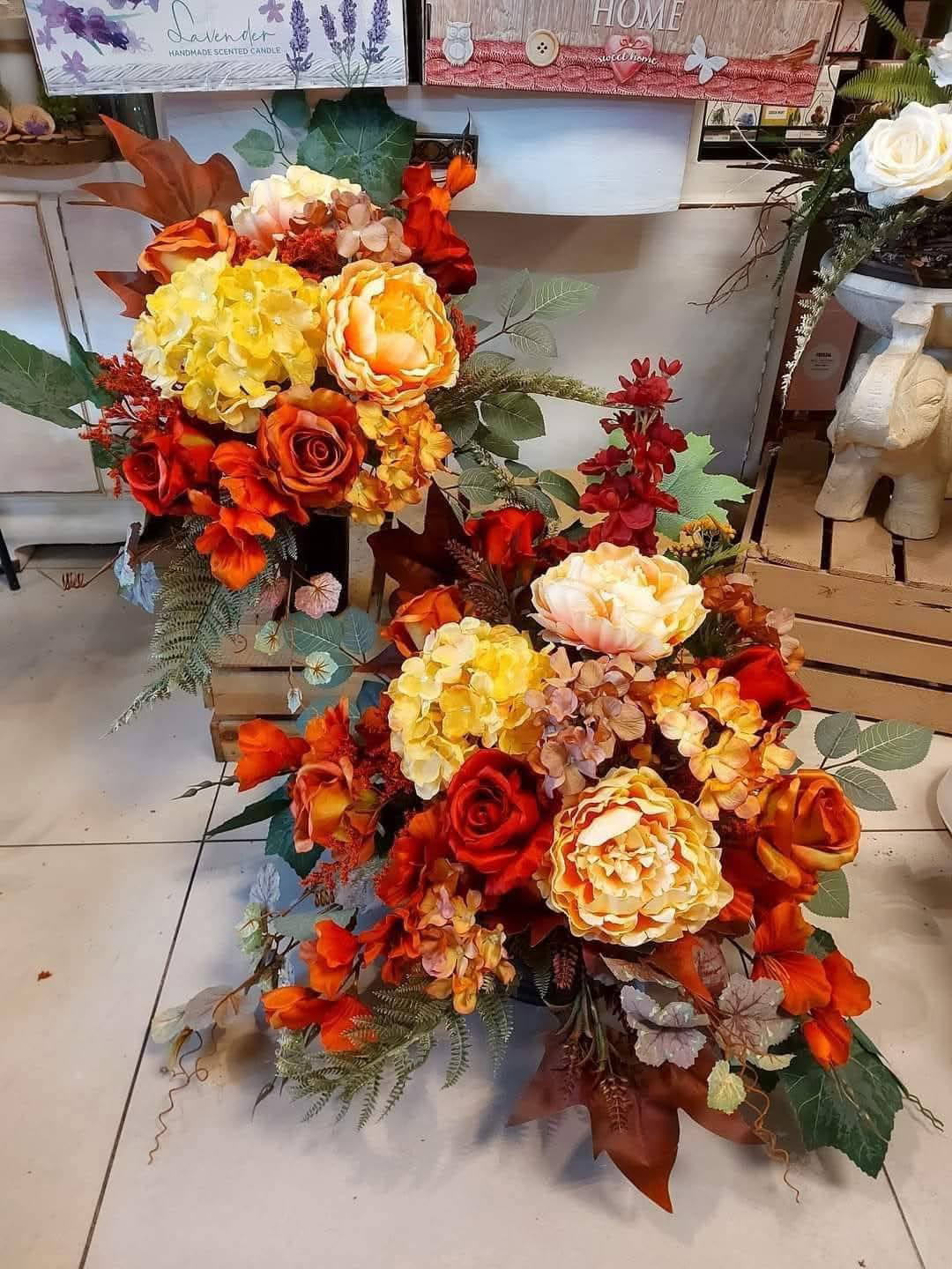 Ten urokliwy komplet stroików zachwyca jesiennymi barwami – czerwienią, pomarańczą i żółcią – z pięknymi różami, hortensjami i zielonymi liśćmi tworzy coś czarującego.