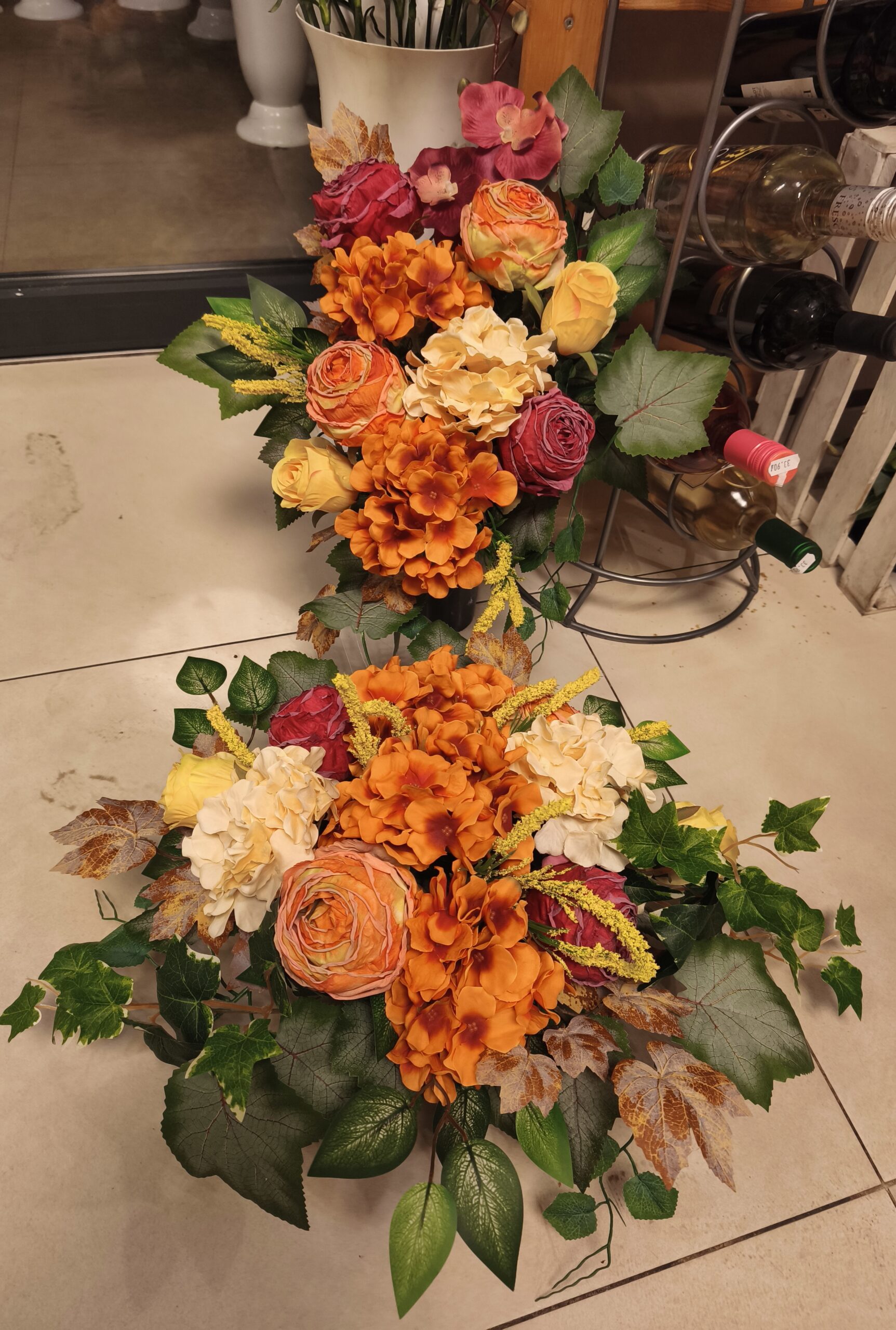 Ta urokliwa kompozycja zachwyca feerią barw – od pomarańczowych i żółtych kwiatów po delikatne białe i czerwone akcenty, oplecione zielonymi liśćmi bluszczu. Prezentuje się ciepło i elegancko
