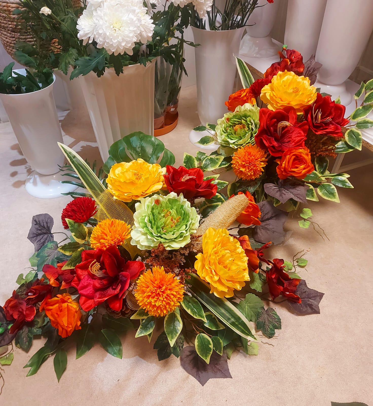 Ten komplet to dwa harmonijne stroiki z intensywnie kolorowych sztucznych kwiatów. Składają się z czerwonych, żółtych i pomarańczowych piwonii oraz zielonych akcentów, oplecionych zielonymi liśćmi i delikatnymi pnączami. Dodatki w postaci złotych elementów i bordowych detali nadają im ciepłego, jesiennego charakteru