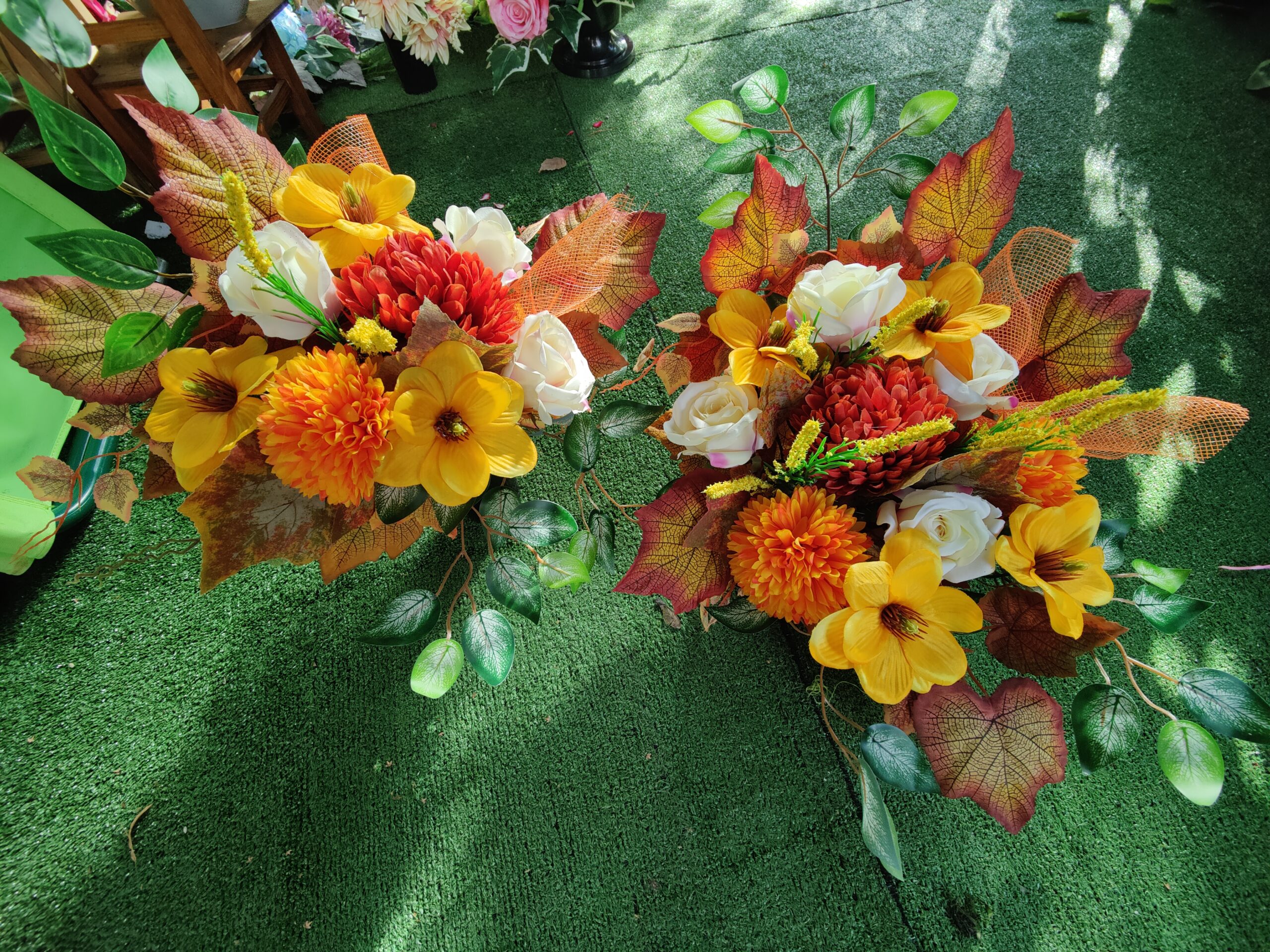 Zestaw dwóch stroików składa się ze sztucznych kwiatów w odcieniach żółci, pomarańczy, czerwieni i bieli, w tym dalii, róż i chryzantem. Każdy stroik ozdobiony jest dużymi, kolorowymi liśćmi o jesiennej tonacji oraz zielonymi akcentami, co nadaje im ciepły, sezonowy charakter