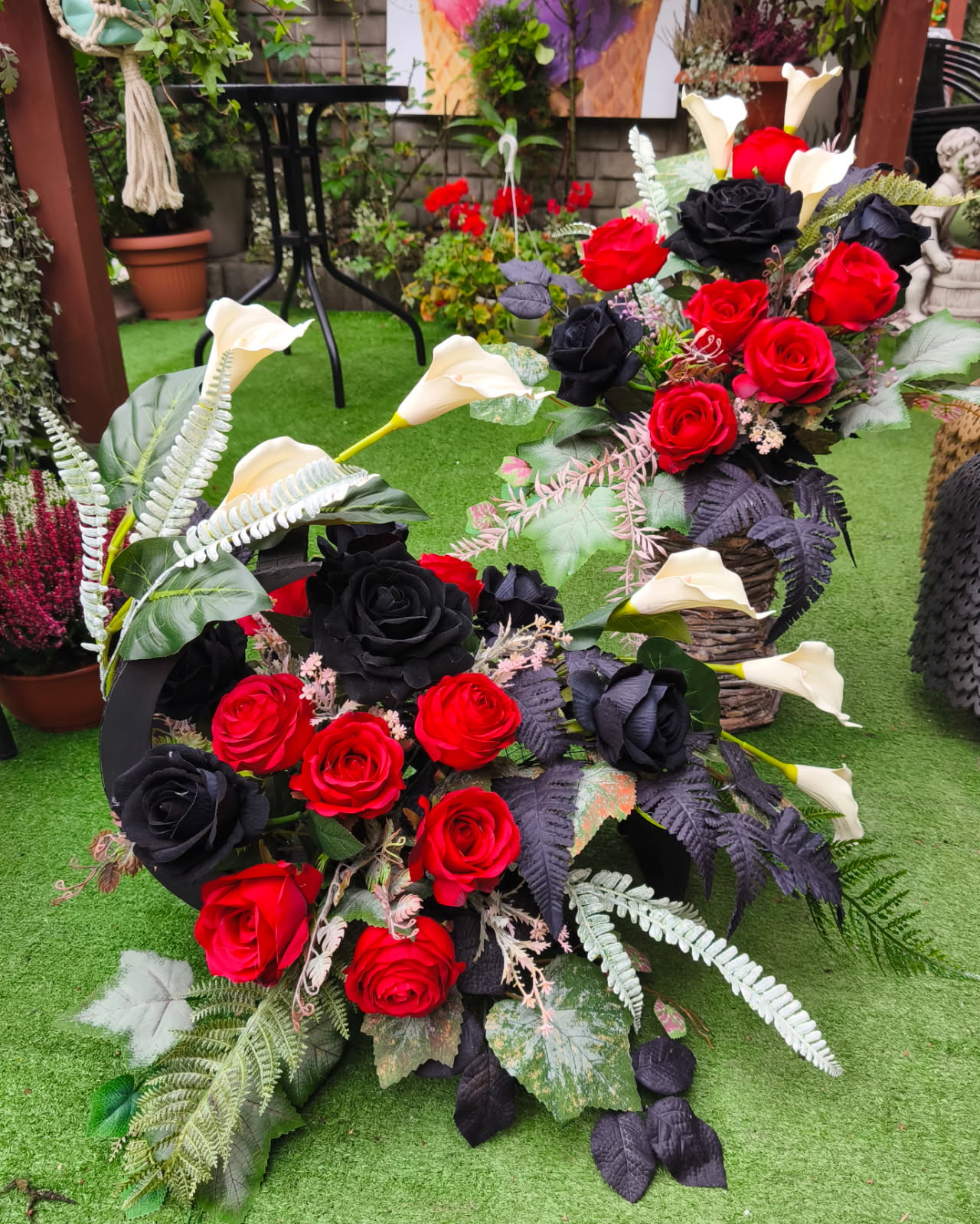 Ta kompozycja kwiatowa wyróżnia się dramatycznym kontrastem głębokiej czerni i jaskrawej czerwieni oraz delikatnymi, białymi kaliami. Ozdobiona jest ciemnymi liśćmi paproci i innymi zielonymi akcentami, co nadaje jej elegancji i głębi. Całość prezentuje się efektownie i nieco mrocznie. Idealny na Święto Wszystkich Zmarłych