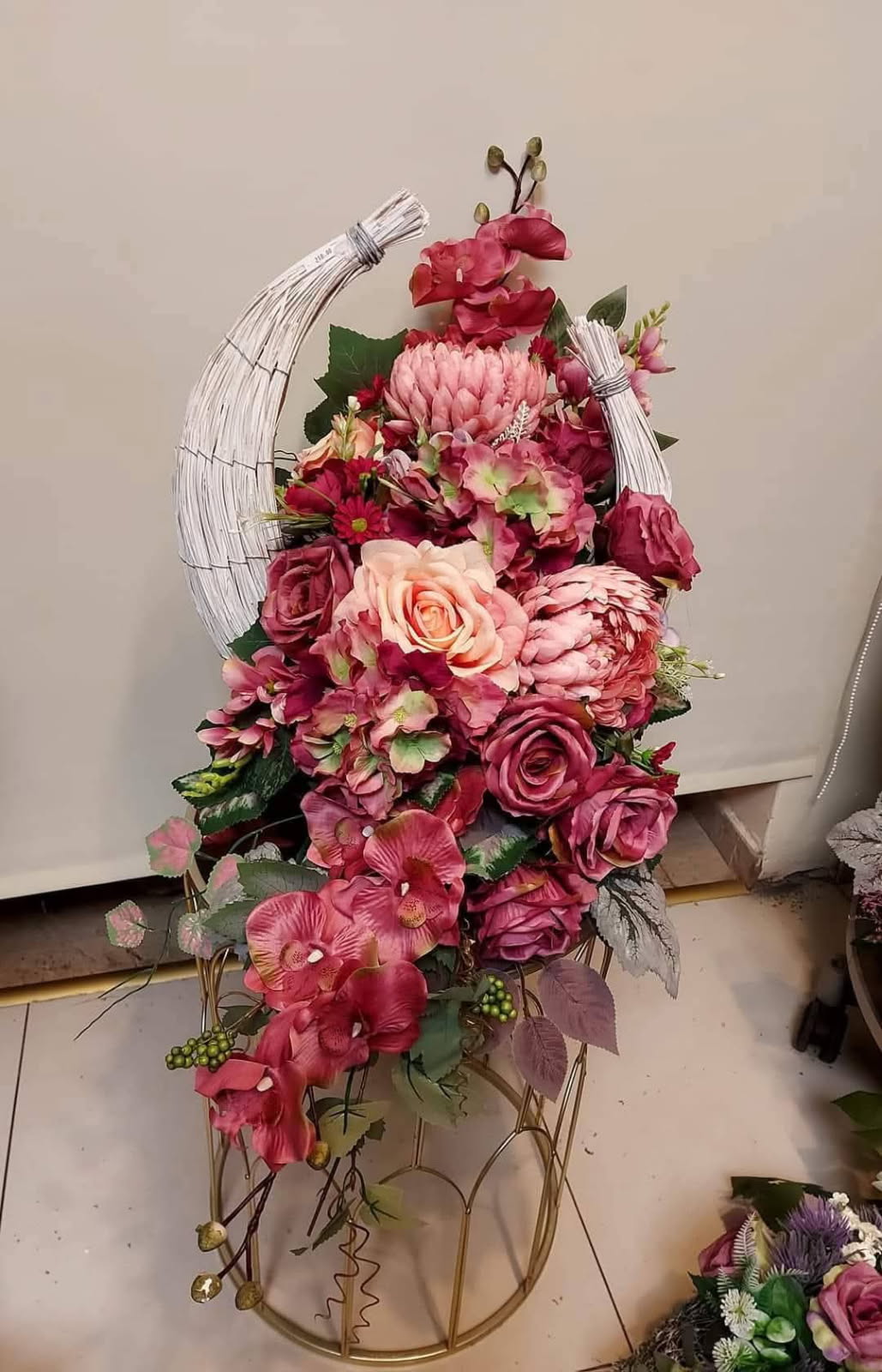 Piękna kompozycja nagrobna w odcieniach różu, czerwieni i brzoskwini, wykonana z delikatnych róż, peonii, orchidei i hortensji, wzbogacona zielonymi liśćmi i subtelnymi akcentami dekoracyjnymi. Umieszczona w eleganckiej konstrukcji z wiklinowym łukiem, tworzy wzruszający i wyrafinowany hołd pamięci bliskich