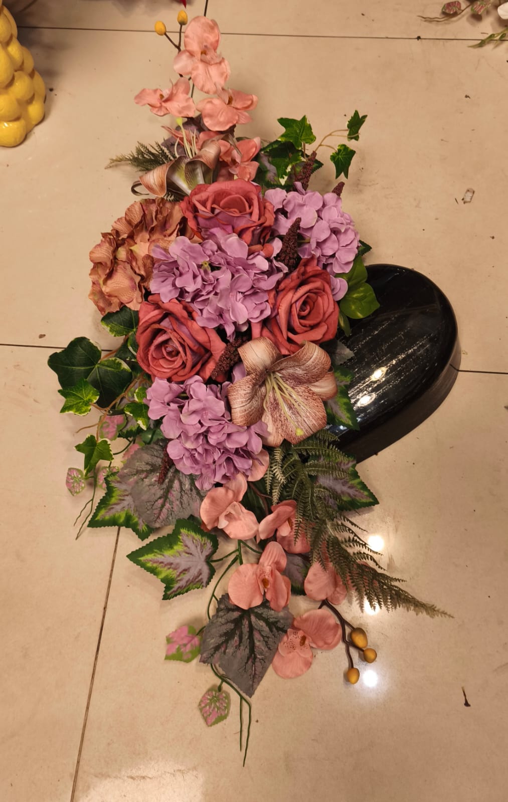 Ta urocza kompozycja kwiatowa składa się z delikatnych róż w odcieniach różu i brązu, fioletowych hortensji, lilii oraz orchidei, wzbogaconych zielonymi liśćmi bluszczu, paproci i innych roślin ozdobnych. Jest to kompozycja w płaskiej donicy w kształcie serca