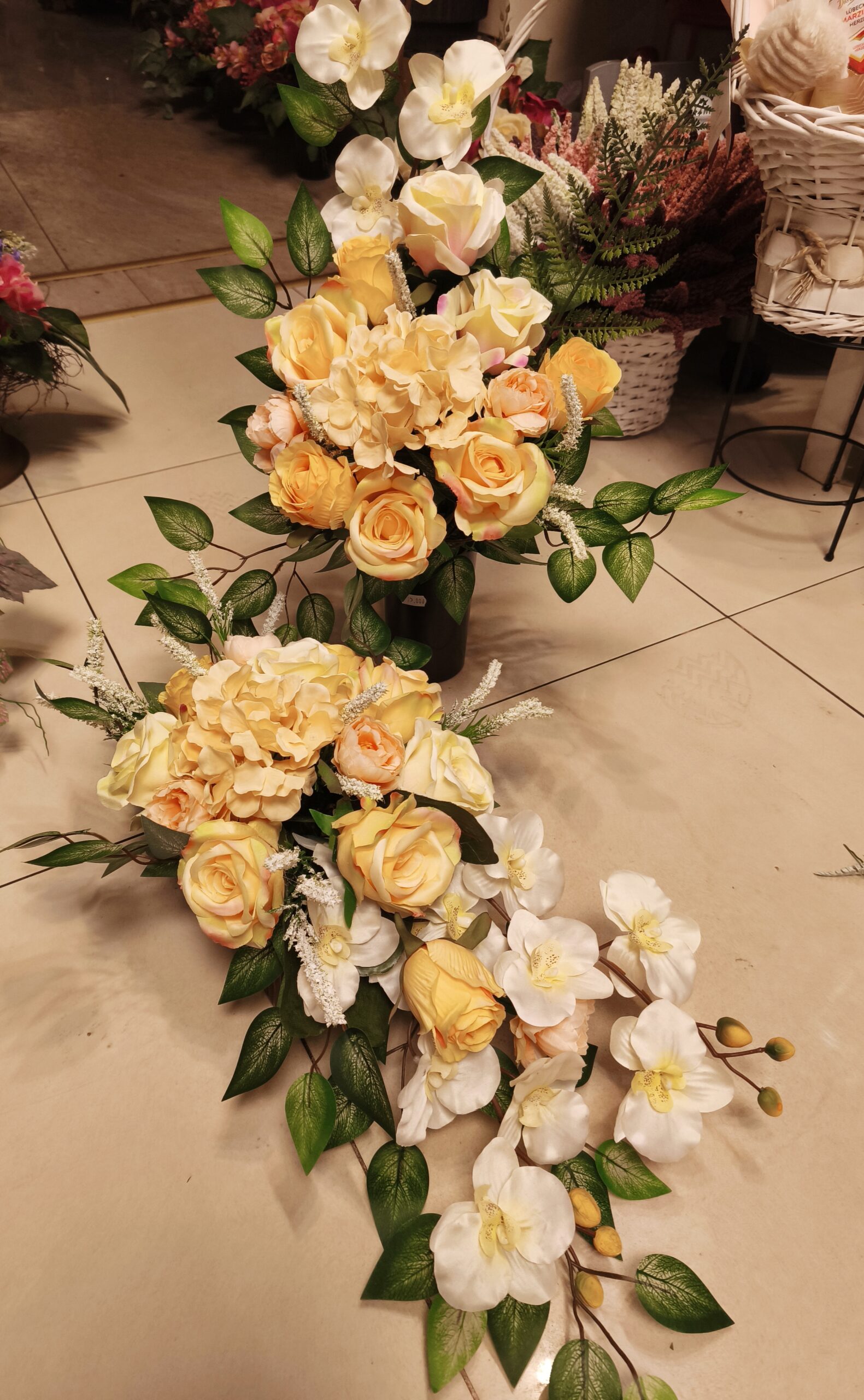 Ten elegancki zestaw stroików składa się z dwóch części: większej kaskadowej kompozycji z zółtych róż, białych orchidei i zielonych liści oraz mniejszej, harmonijnie dopasowanej aranżacji. Całóść zachwyca delikatnością i subtelnym urokiem