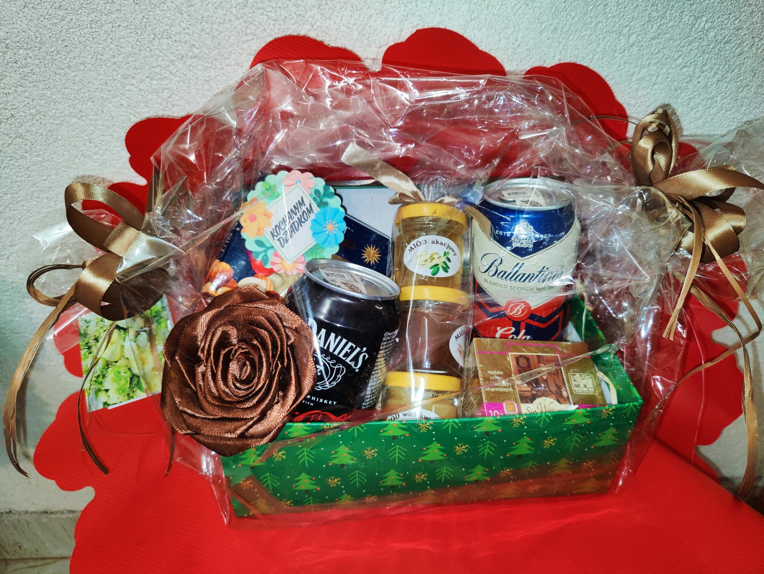 Pięknie zapakowany koszyk w zielonym pudełku ze świątecznym motywem choinek, owinięty folią, ozdobiony brązowymi wstążkami i satynową różą. Gotowy do wręczenia – idealny na Dzień Dziadka, Święta czy urodziny.