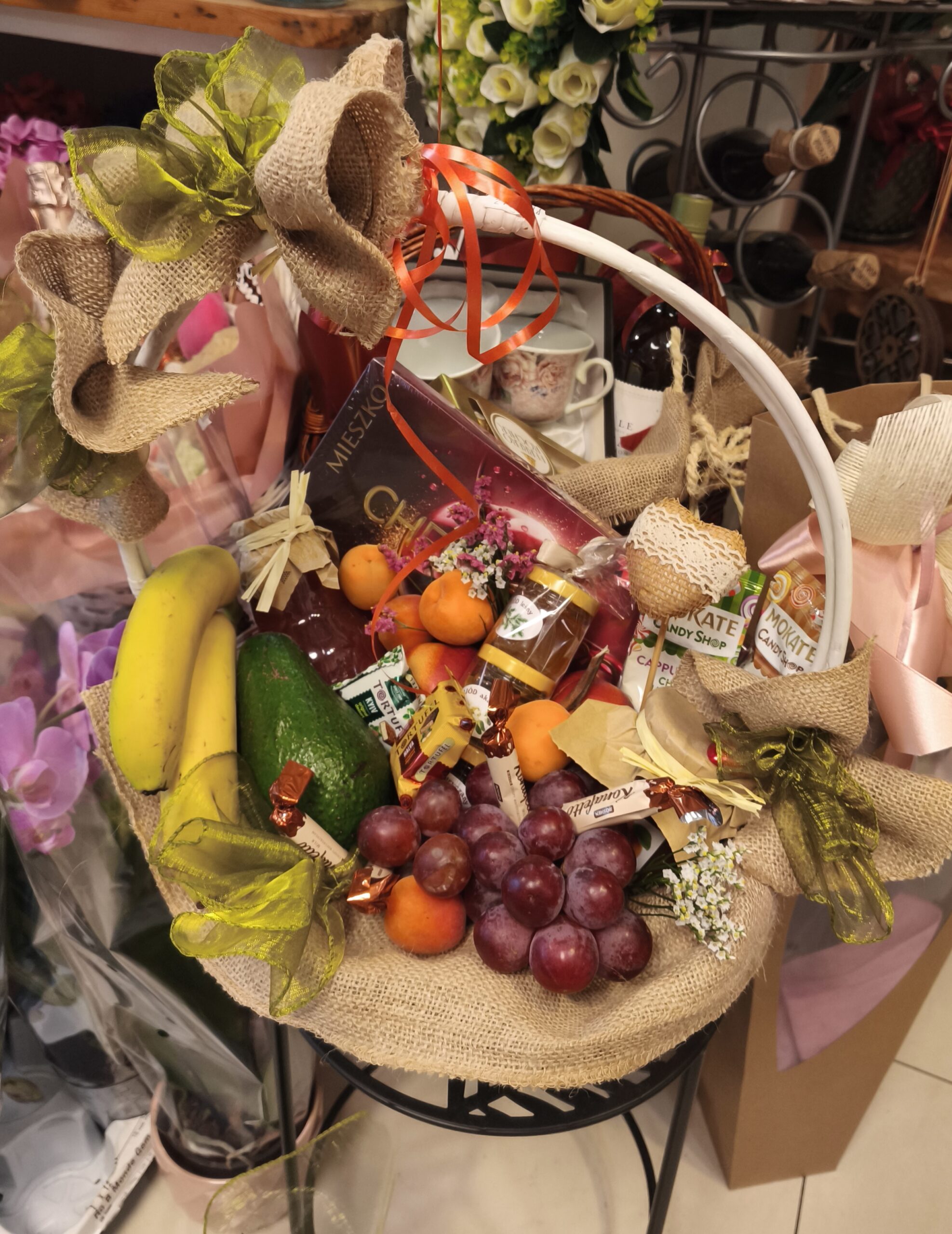 Kosz zdrowia zawiera bombową dawkę witamin w postaci owoców ,miodów, owocowej konfitury oraz przecierowego soku owocowego z dodatkiem łakoci w postaci pralinek i ciasteczek do kawy cappucino. Wszystkie produkty umieszczone są w eleganckim koszu wiklinowym z uchwytem gustownie udekorowanym naturalnymi dodatkami w postaci elementów z materiału jutowego.