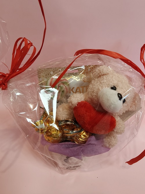Całość otulona fioletowym akcentem, zapakowana w przezroczysty celofan z czerwonymi wstążkami i kokardami – gotowy prezent, który wygląda premium i pachnie miłością.