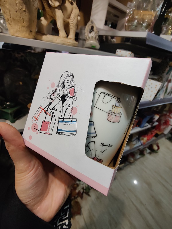 Kubek ceramiczny ze stylowym nadrukiem, odporny na uszkodzenia, można myć w zmywarce. Idealny prezent dla kobiety uwielbiającej zakupy. Pojemność 330ml